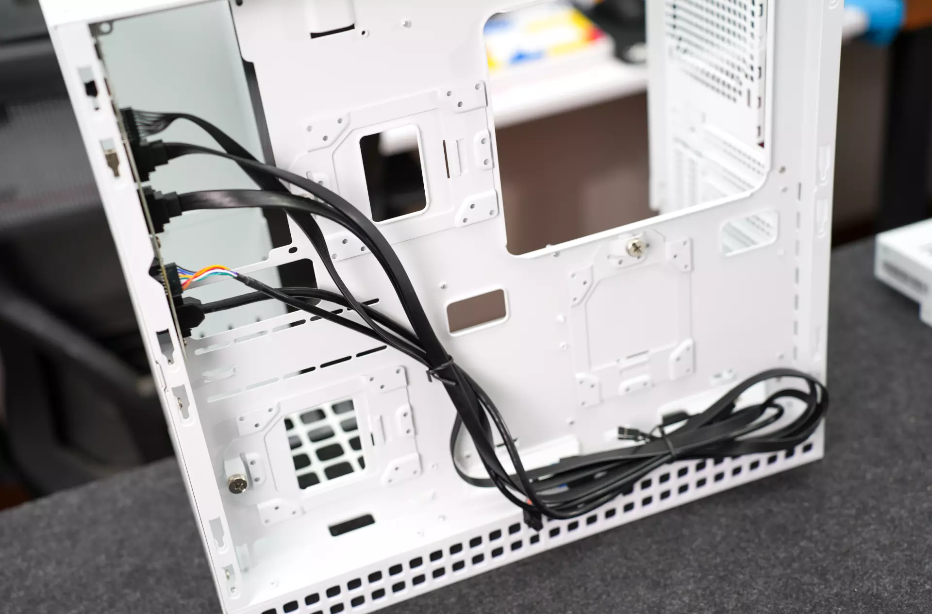 几何未来M4的背面有3个通用支架,可以装入3个2.5英寸硬盘或者2个3.5英寸硬盘以及1个2.5英寸硬盘。同时,给出的背线空间也非常充裕。