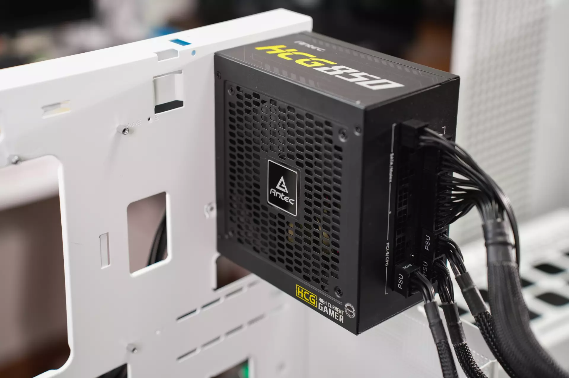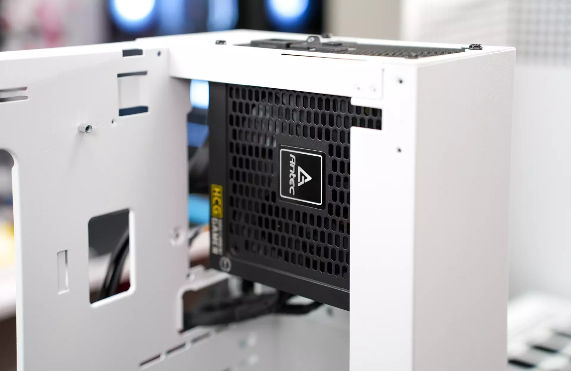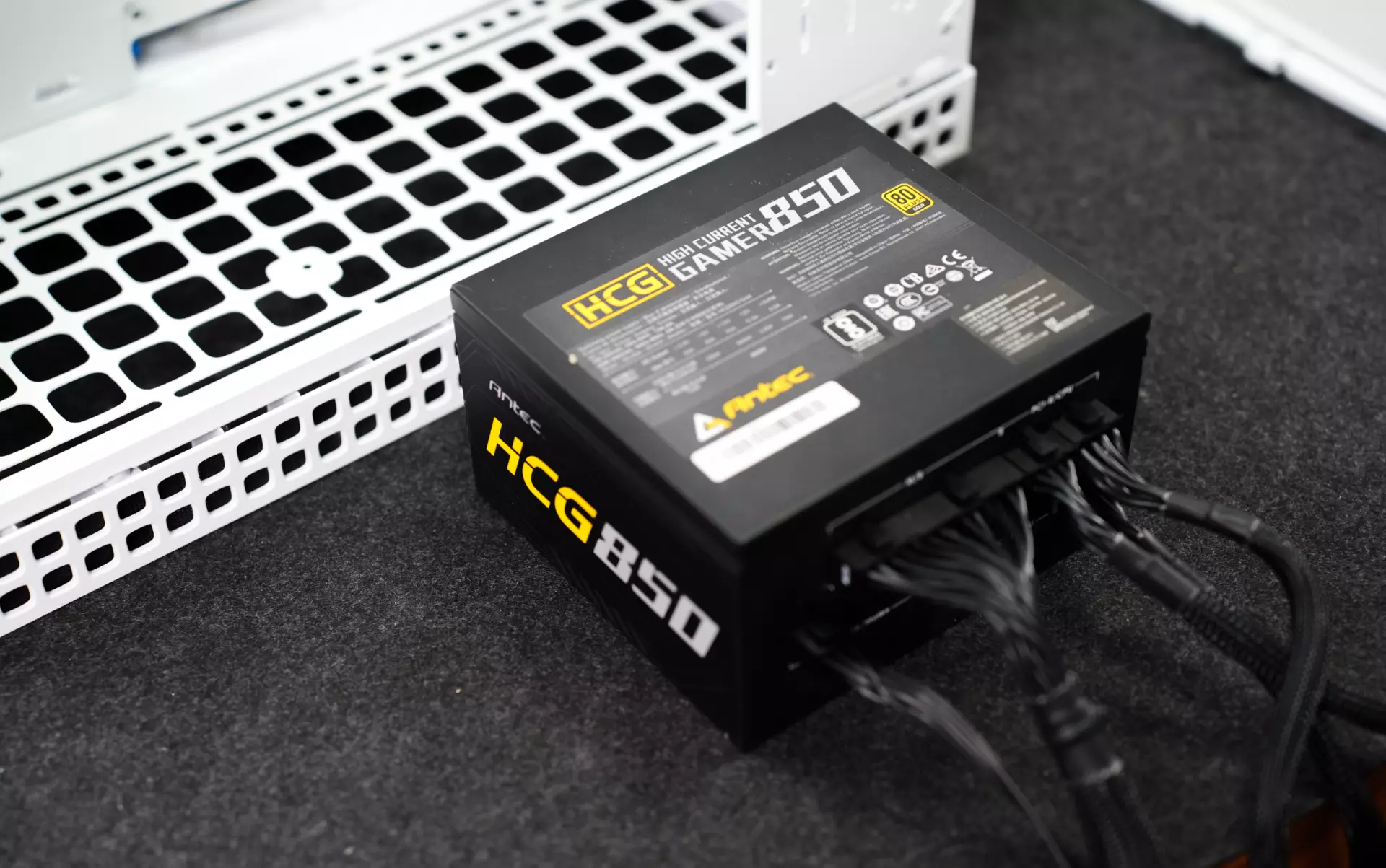 第一步是装入电源,我选择的电源是安钛克HCG850,该电源为主动式PFC+全桥LLC谐振+同步整流+DC-DC架构,全日系电容,全模组线材设计,风扇支持启停功能。安钛克官方也是保证十年内故障只换不修。