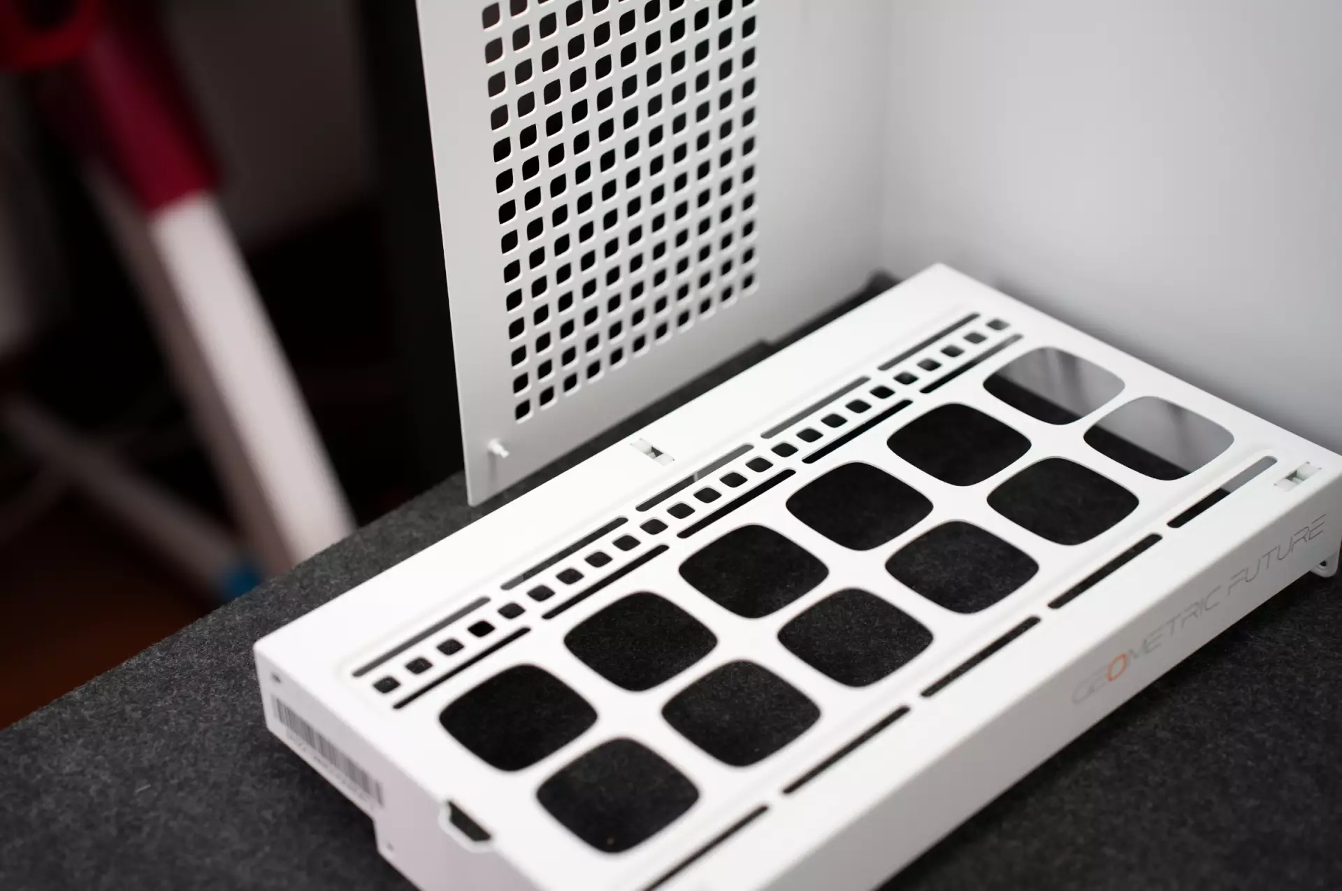 将几何未来M4进行拆解,分别可以看到顶部支架、防尘网以及左右2块侧面板。从图片上来看,很多小伙伴是不是觉得这个是模块式设计?实际上开始装机的时候我也觉得这样的设计还不错,但后面装机的时候觉得这样的设计还是存在的一些槽点。