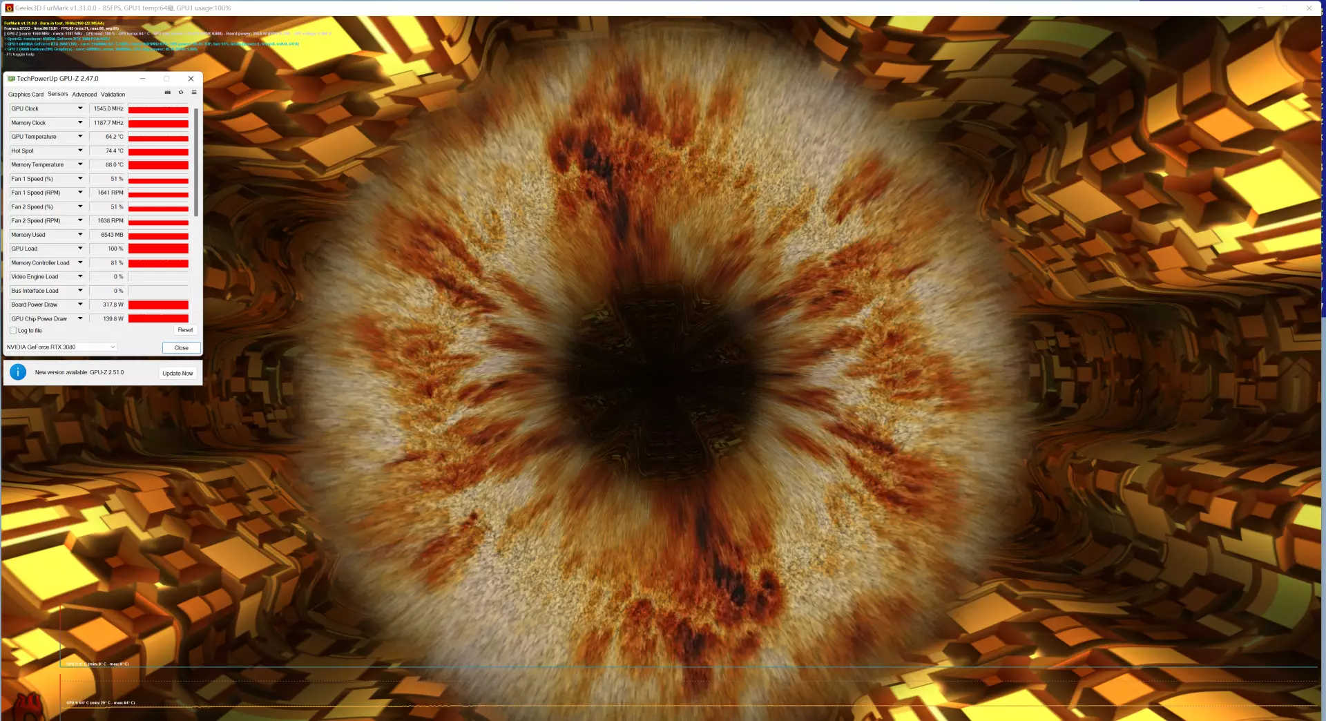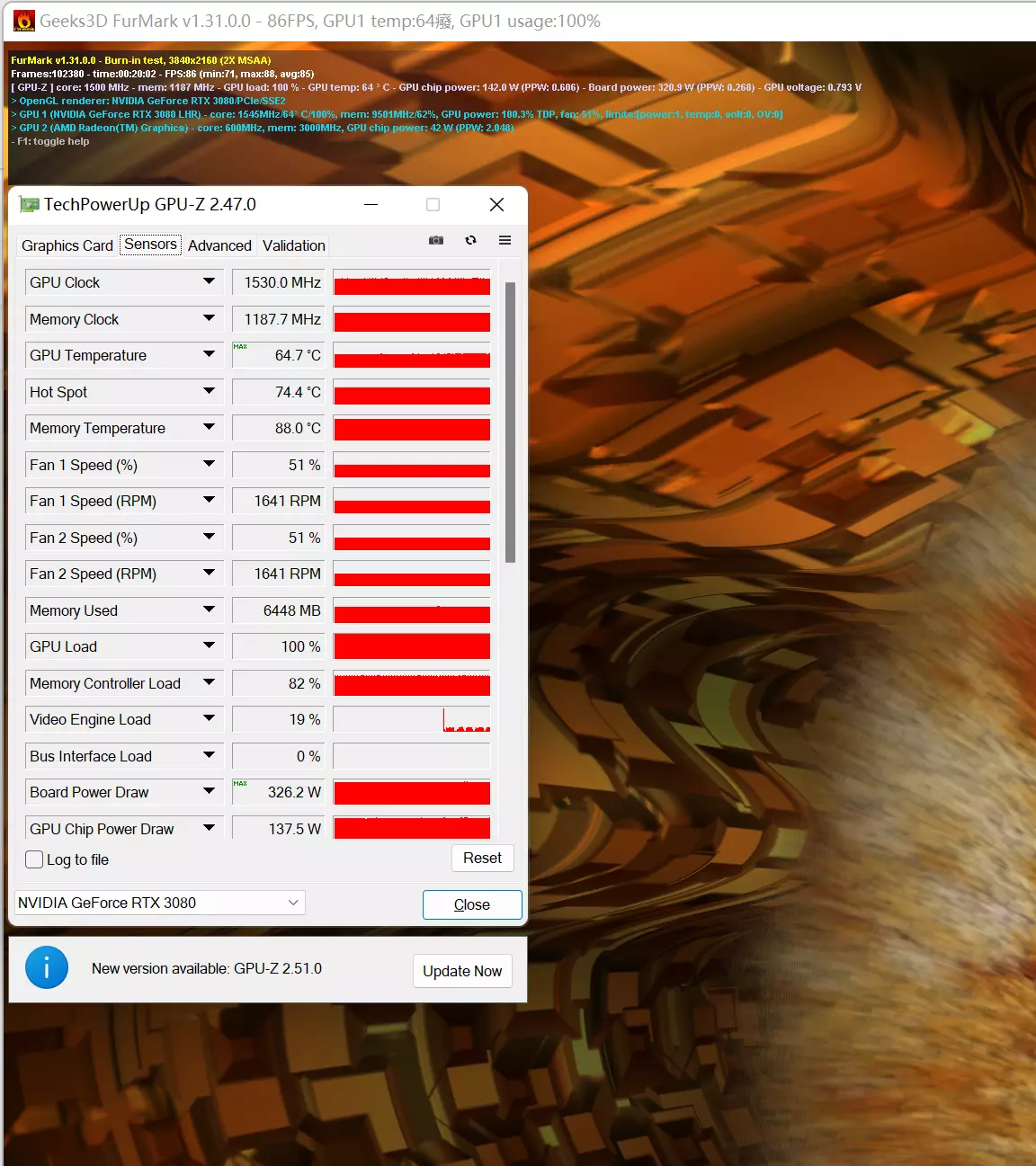 显卡方面,经过FURMARK 20多分钟的拷机测试,GPU的温度最高为64.7℃,整张卡的功耗为功耗300W左右,最高功耗为326W。