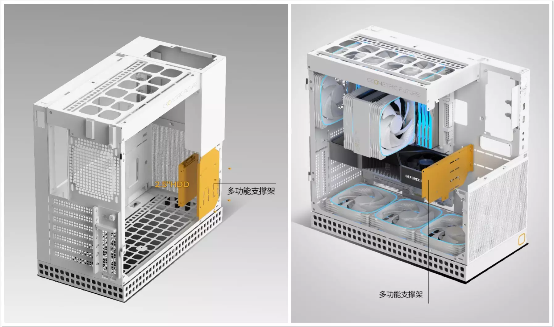 电源仓下方的是一块多功能支架,可以装入2.5英寸硬盘,也可以变为一个显卡支架。