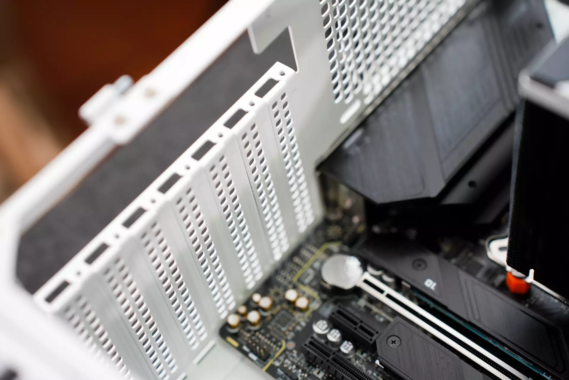 机箱内部的五金用料也比较厚实,内部空间方面很是充裕,最大居然可以装入E-ATX主板。要知道现在市面上很多小钢炮机箱能装下ATX主板就不错了。至于CPU散热器高度最大支持164mm,显卡长度最大支持405mm。