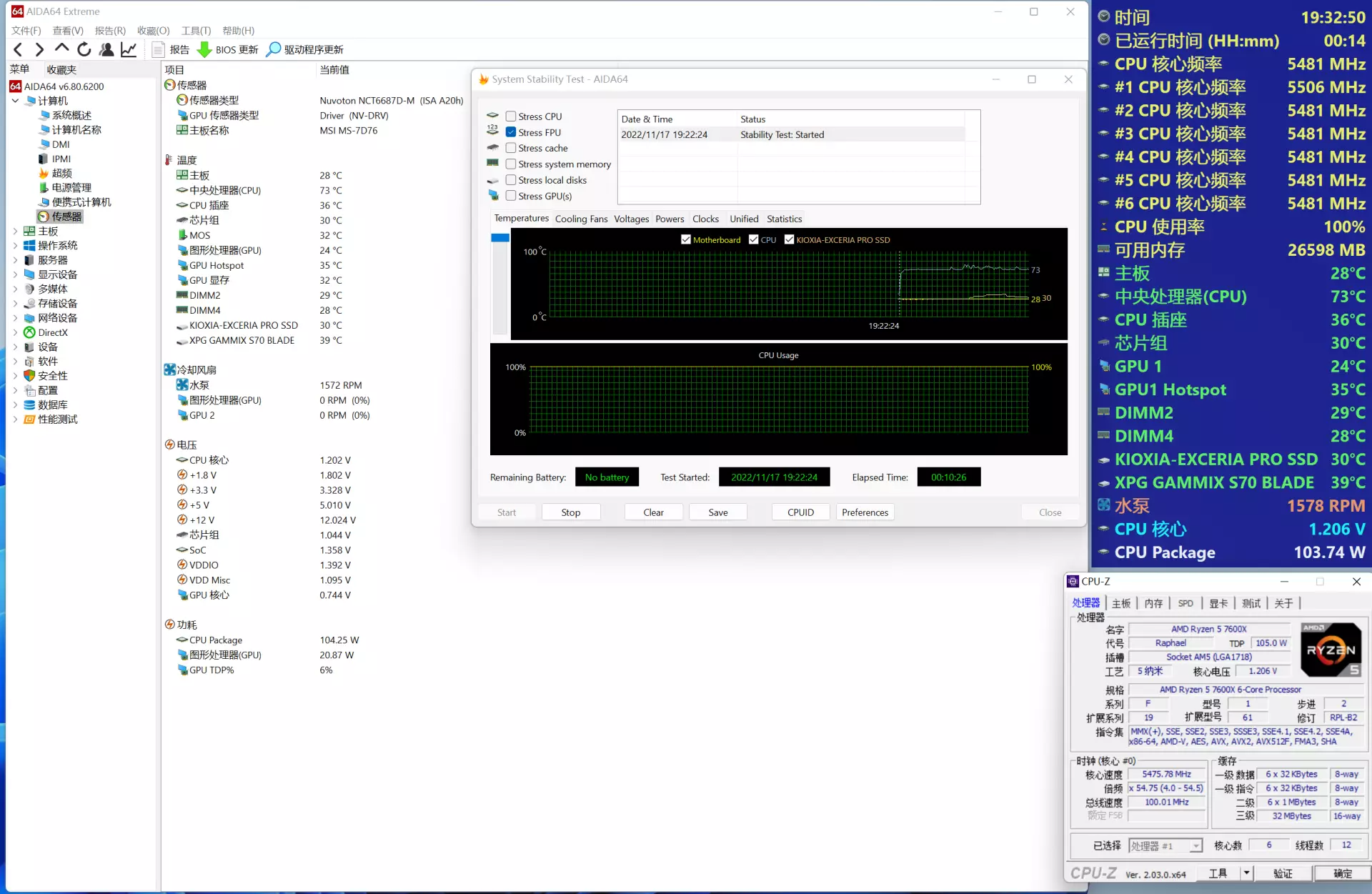 通过AIDA64单烤FPU 10多分钟,实测温度在76~73℃之间波动,CPU全核为5.5GHz,核心电压为1.206V,功耗为105W左右。也说明超频三K4挑战者这款风冷散热器与几何未来M4机箱的风道表现也确实不错。