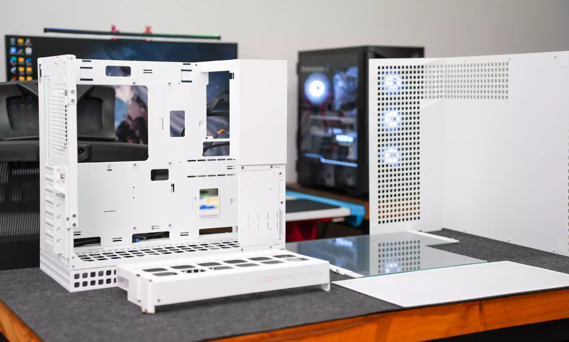 并且异形的钢化玻璃设计的侧挡板还是磁吸侧开的方面,方便用户进行简单的维护和硬件更换。