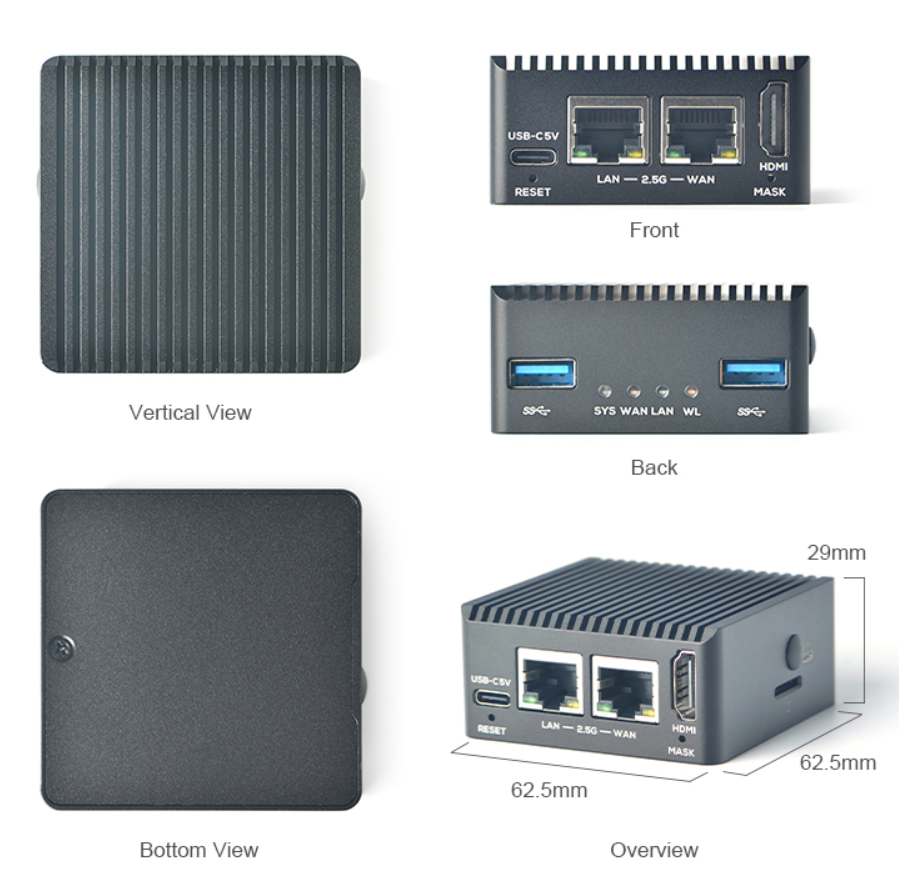 NanoPi R5C 采用瑞芯微 RK3568B2 作为主控处理器,配备 1GB / 4GB LPDDR4X 内存,和 8GB / 32GB eMMC 闪存,并支持 TF 卡启动和运行系统,搭载双 2.5G 有线网口,两个 2.5G 网口传输速率均为 2.10Gbps,接收速率为 2.30Gbps。