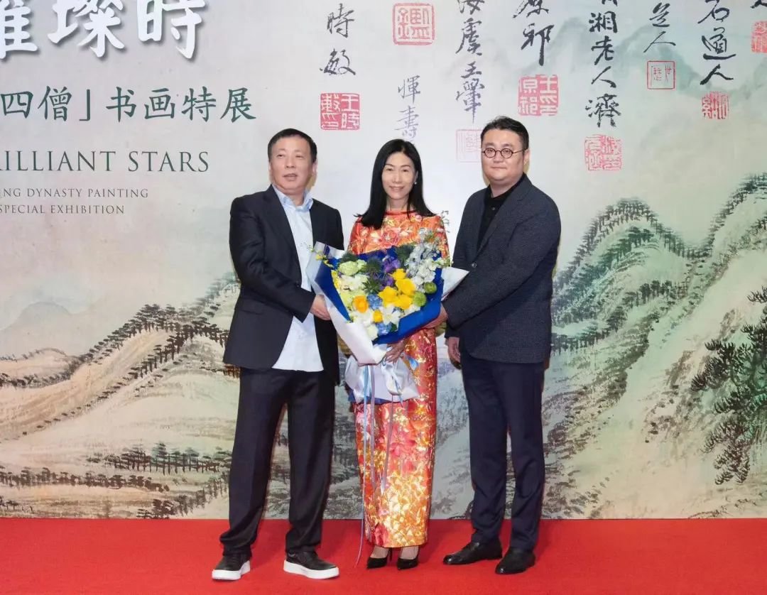 展览开幕式现场 从左至右:龙美术馆创始人、“群星璀璨时——四王吴恽与四僧书画特展”总策划刘益谦,龙美术馆创始人、馆长王薇,“群星璀璨时——四王吴恽与四僧书画特展”策展人谢晓冬。摄影:shaunley
