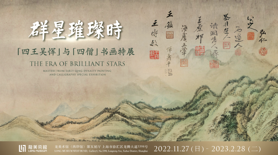 2022年11月27日至2023年2月28日,“群星璀璨时——四王吴恽与四僧书画特展”在龙美术馆(西岸馆)第五展厅展出。此次展览于龙美术馆十周年呈现,精选清初王时敏、王鉴、王翚、王原祁、吴历、恽寿平、八大山人、石涛、弘仁、髡残十位画家的三十余件(组)精品力作,其中近二分之一的作品为首次面向公众展出。
