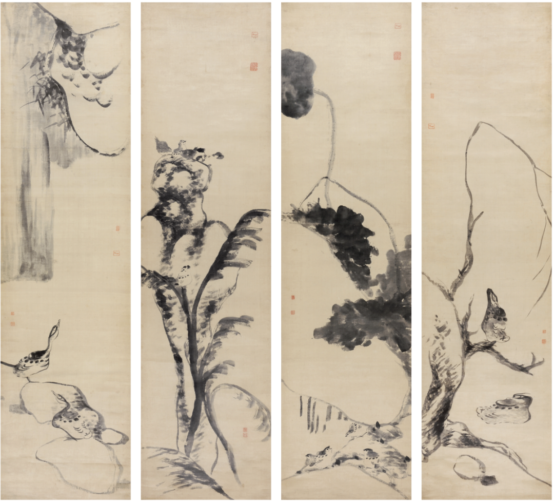 八大山人,《鸟鸭图四条屏》,208×55cm×4,条屏,绫本水墨,清代