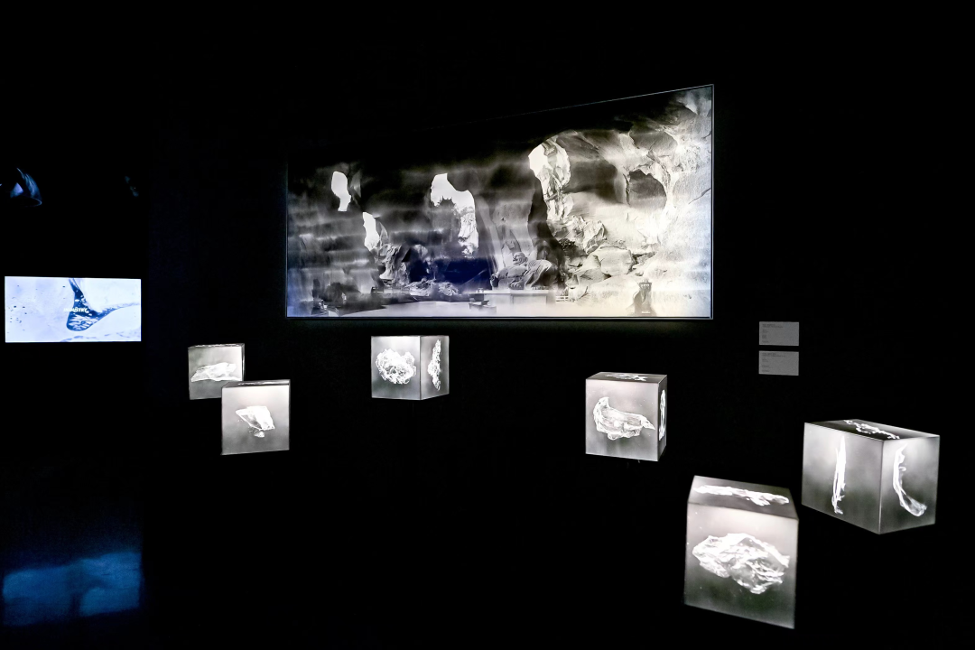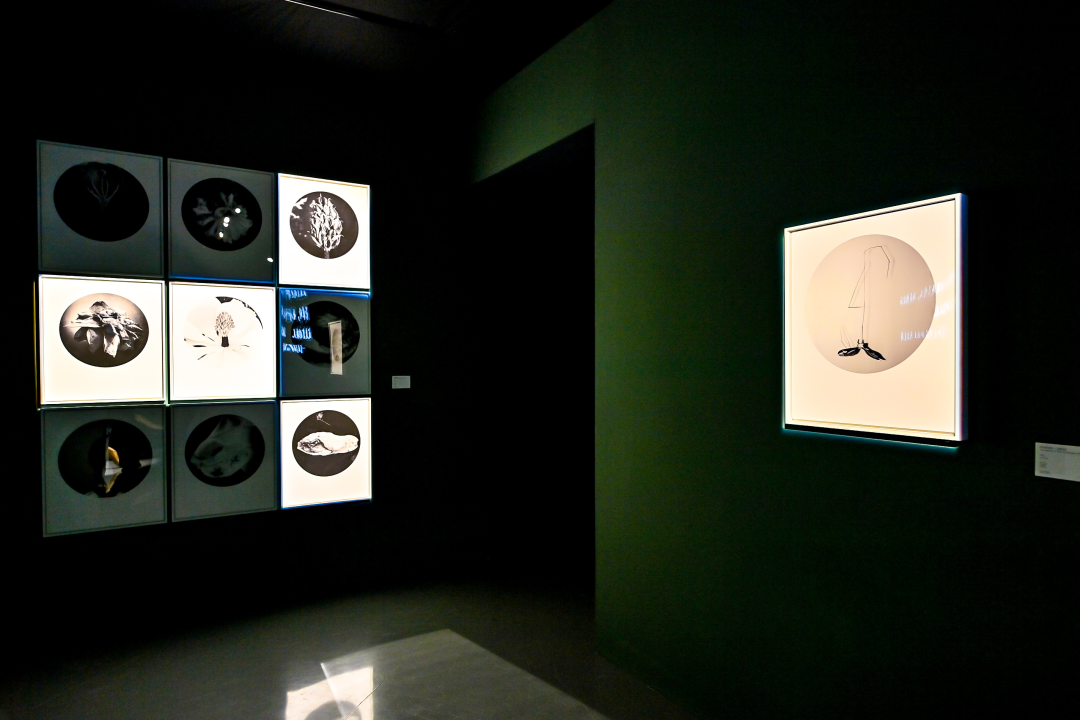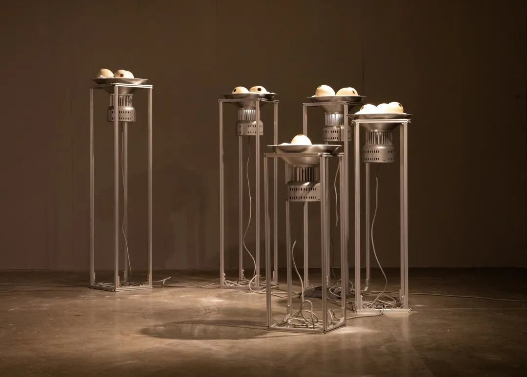 ▲ 徐思捷 《起源——狄奥尼索斯》 鸵鸟蛋壳 明胶银感光乳剂 合金罩 LED 灯 铝型材 白石英砂 尺寸可变 2021