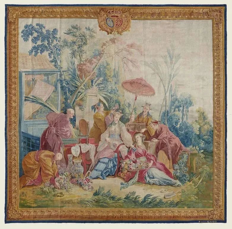 这件属于《“中国风”风景挂毯》系列,1725年到1730年左右,法国奥布松和费勒坦(Felletin)地区的许多挂毯作坊都在织造这种挂毯。以植物为主要表现对象的风景挂毯或翠绿挂毯在欧洲并不陌生,16世纪下半叶就有非常成熟的作品,但“中国风”风景挂毯却在此时才出现。