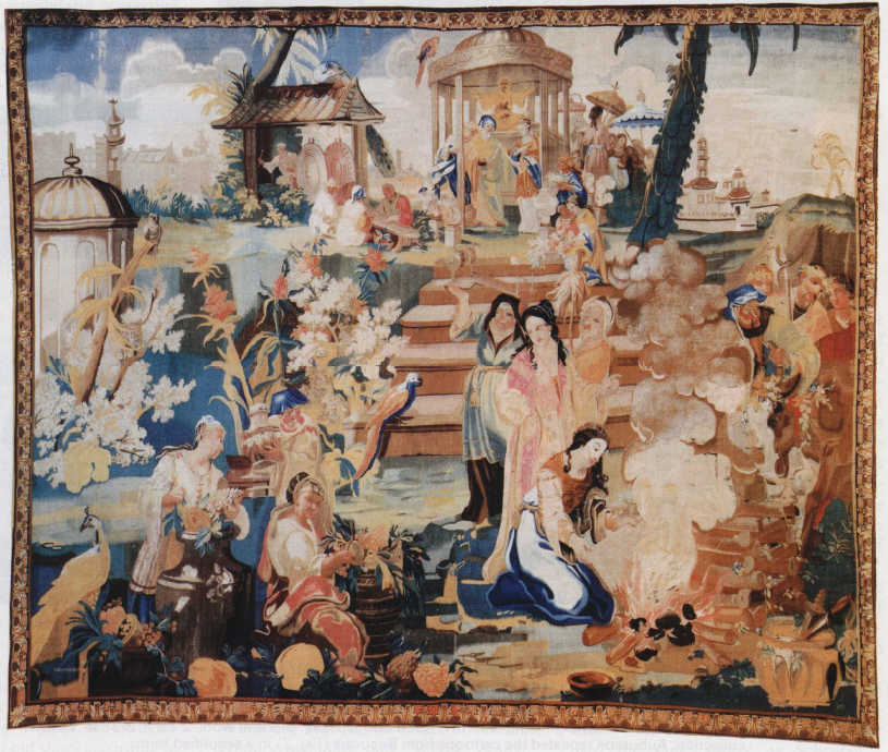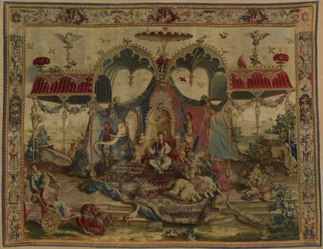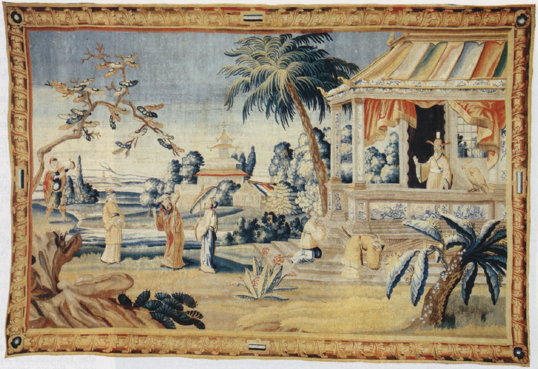 但在17世纪后期,由于“中国风”在欧洲诸国的流行,一类新的主题的挂毯——“中国风”挂毯开始出现,并很快在法国、英国、弗林德斯、德国等多个国家和地区流行与织造。