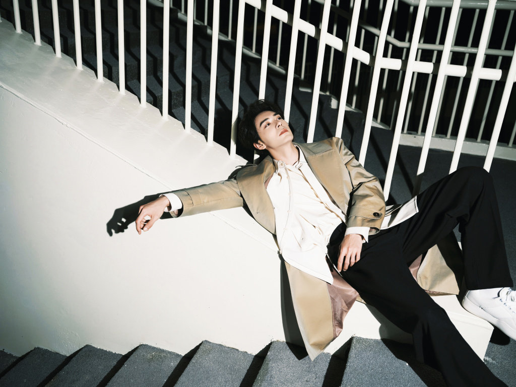 2022年11月30日,陈星旭发布一组风衣造型楼梯转角夜景写真。