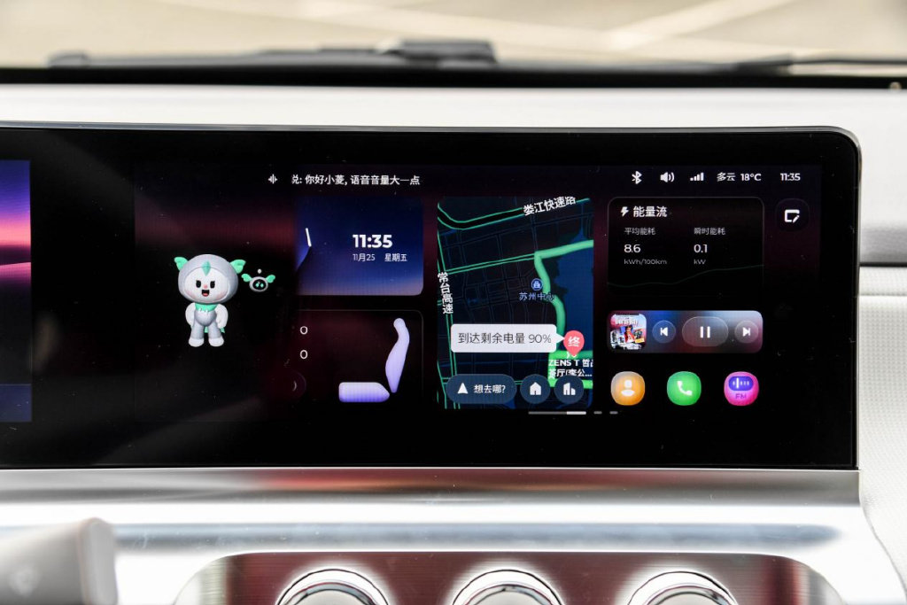 右侧的10.25英寸屏幕搭载了Ling OS车机系统,支持导航系统,并且还配备了喜马拉雅、酷我音乐等第三方APP,语音控制系统也十分好用,可用于控制空调、车窗以及音乐。
