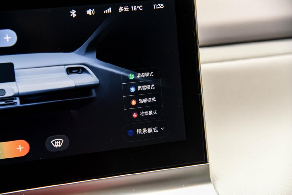 车机系统右下角可以看到情景模式的选择,分别有清凉、雨雪、温暖以及抽烟模式,选择不同模式车辆会将空调以及车窗调整为预设的状态,比如在抽烟模式下,会自动打开车窗,并且将外循环打开。