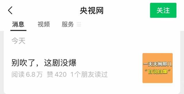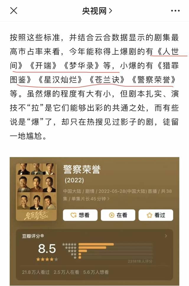央视网发表了一篇《别吹了,这剧没爆》,矛头直指爆剧吹嘘现象。其中提到了七部爆剧,包括大爆剧《人世间》、《梦华录》和《开端》,小爆剧有《猎罪图鉴》、《星汉灿烂》、《苍兰诀》、《警察荣誉》,伪爆剧是还没有播完的《爱的二八定律》、《点燃我温暖你》。