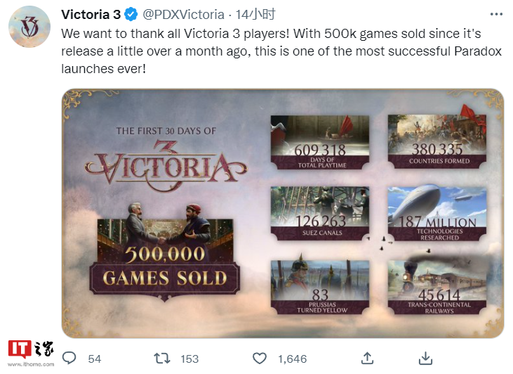 IT之家 11 月 30 日消息,P 社的历史策略游戏大作《维多利亚 3》于 10 月 25 日正式发售,时隔一个多月,游戏销量突破 50 万份。