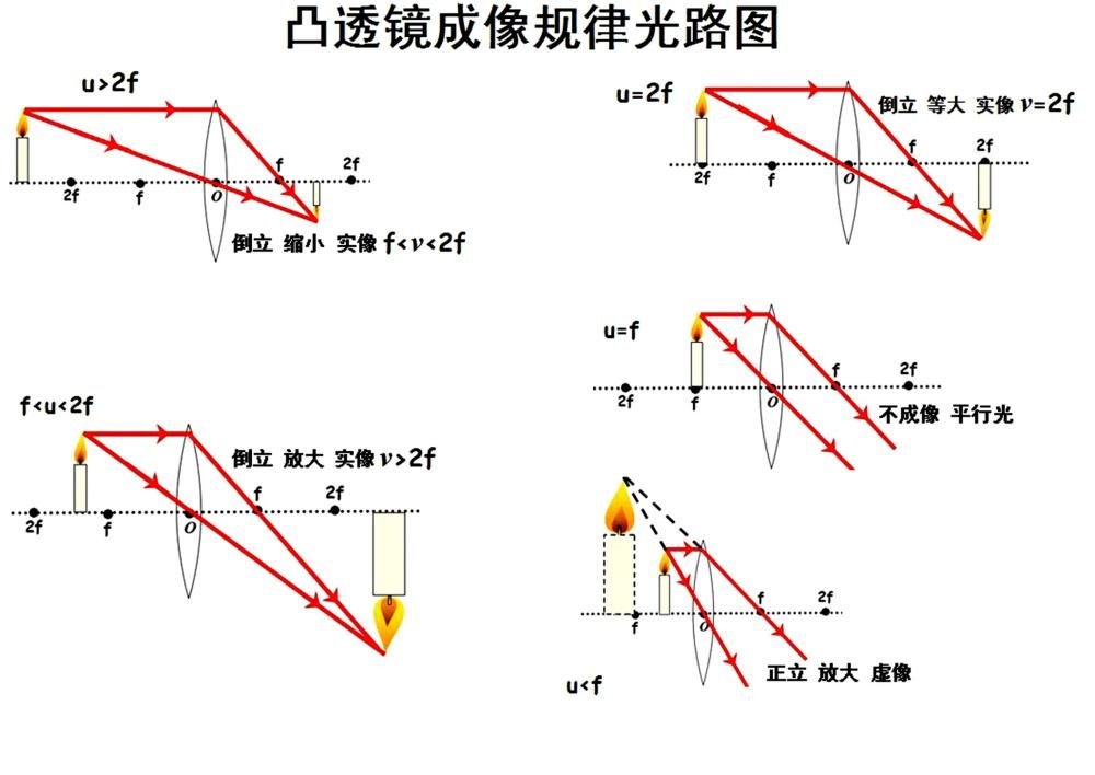 这一步尤为关键,因为无论是做实验还是看视频,都只是从现象上得到的结论,而不是从物理原理上得到的结论,所以,对于物体在两个特殊位置、三个区域中所成像的规律,必须得到理论上的支撑,也就是成像光路图!利用三条特殊光线中的两条光线,我们可以得到如下五个原理图。从而得到成像情况,以及物距和像距规律。