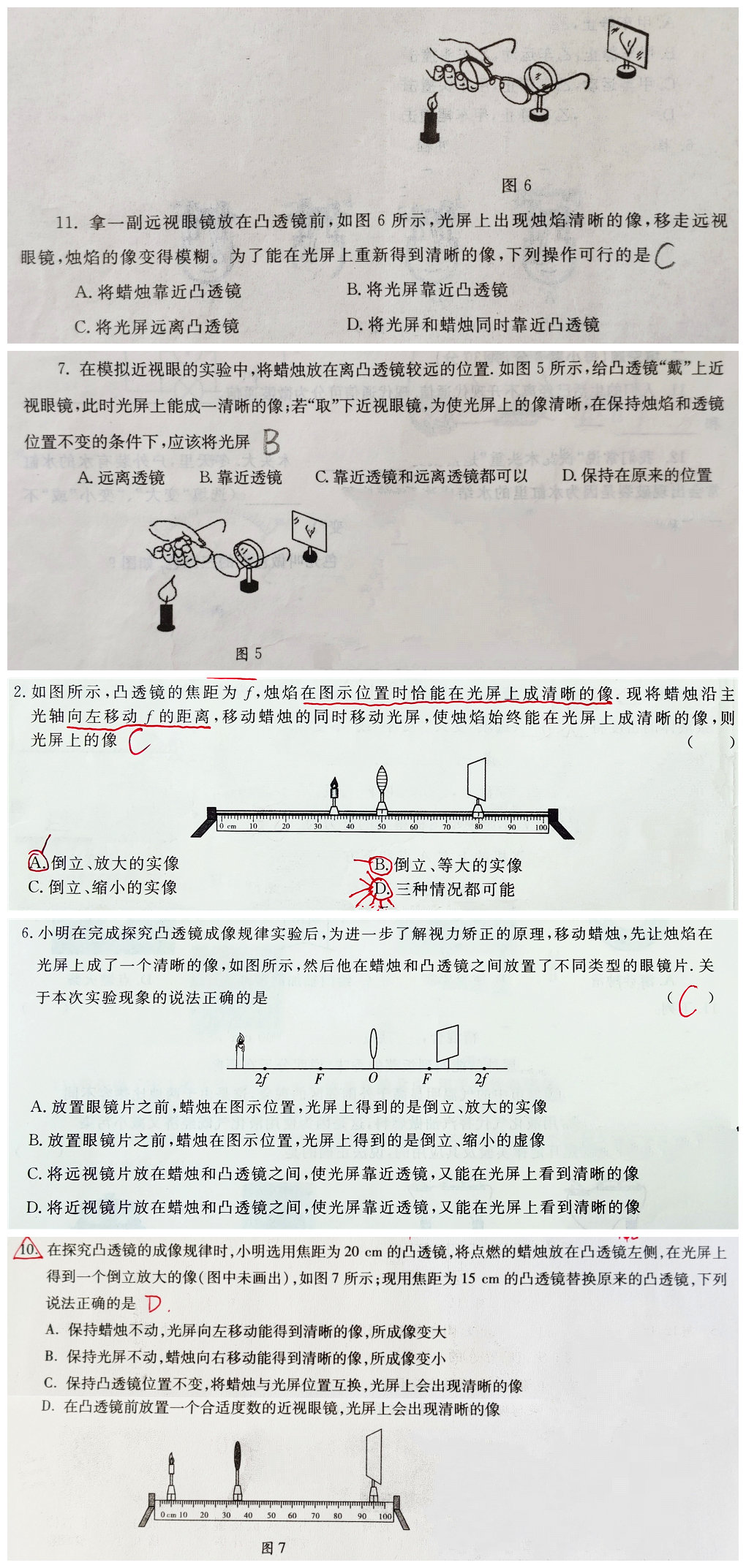 通过以上三种方法,最终彻底掌握凸透镜成像规律后,就可以在习题中大显身手了,结合各种题型,灵活运用以上规律,类似下面的这种题就会在中考时成为送分题。