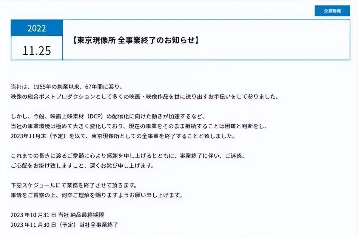 近日,日本东映旗下公司东京现象所在官网宣布,将在 11 月 30 日正式结束其长达 67 年的胶片冲洗业务。在公告中,东映与东京现象所表示,由于使用数字电影包(DCP)分发影片的面世,以及手机数字文件来储存和传输电影的趋势明显增加,公司的胶片冲洗业务难以继续持续下去。11 月 30 日后,东京现象所将被关闭,其数字影像和视频编辑业务将转移至东映工作室,存档业务则将转移至东映新成立的存档公司。