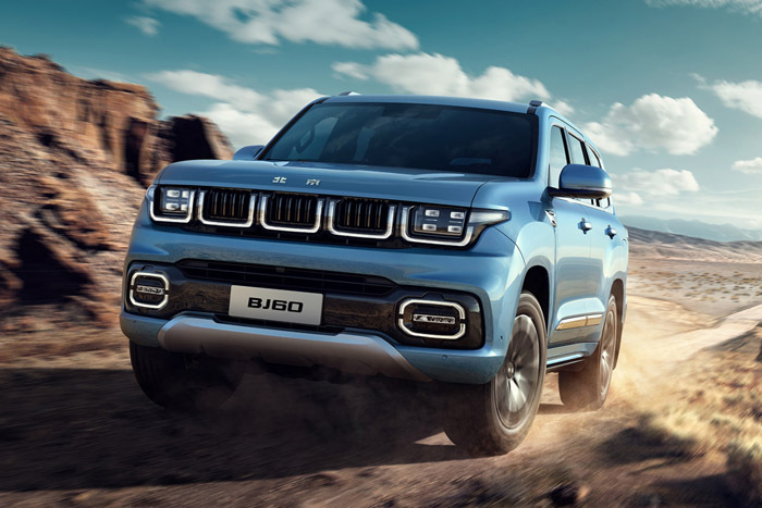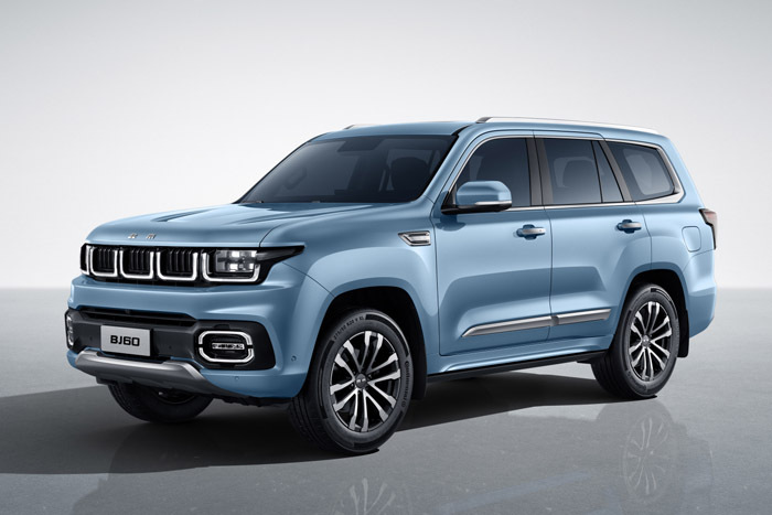 车身侧面,新车采用了标准的SUV车身结构,前后轮拱的外突设计和陆巡有异曲同工之妙,前轮翼子板处还设计有品牌铭牌,侧裙处则妆点有粗壮的镀铬式条,并配备了18-20英寸双六辐式的轮圈,但侧面不管是线条还是型面同样略显圆润,整体感觉虽高大魁梧但还是少了BJ40的那份硬朗和野性。
