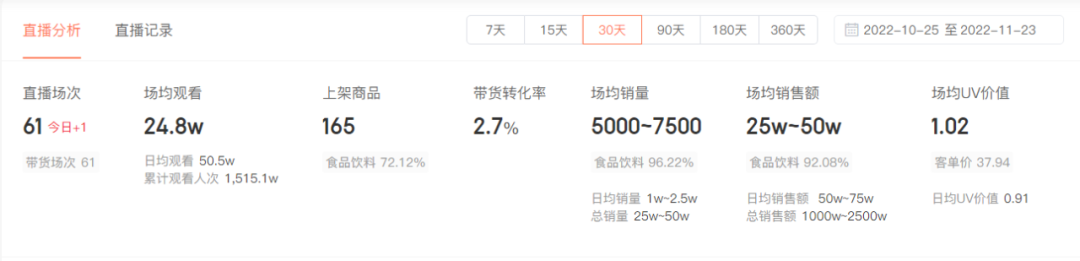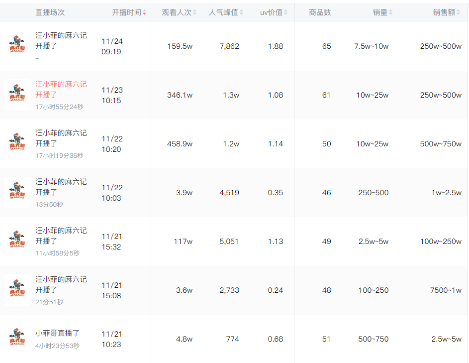 据蝉妈妈数据,麻六记直播间在10月20日-11月20日的场均观看量为9.6万,场均销量为1000-2500,场均销售额7.5万-10万。在11月21日、22日两天,麻六记直播间场均观看量涨至117.7万,场均销量为2.5万-5万,场均销售额为100万-250万。11月22日上午10:20开播的直播销量甚至超7.5万,销售额超250万。场均观看量、销量和销售额三个数据均翻十倍。