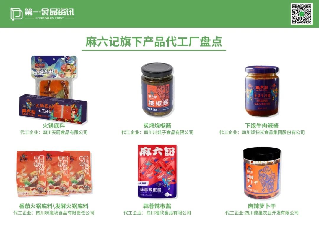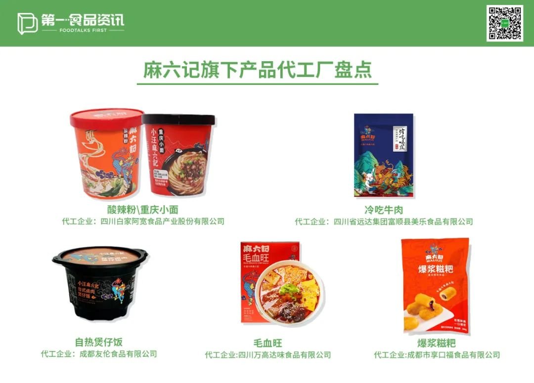 与此同时,麻六记背后的代工厂被悉数扒出,里面有多家来自四川的供应链企业,且很多都是大家熟悉的品牌,比如天厨食品、白家阿宽、饭扫光、友伦、美乐、川娃子、味魔坊、万高达味等。