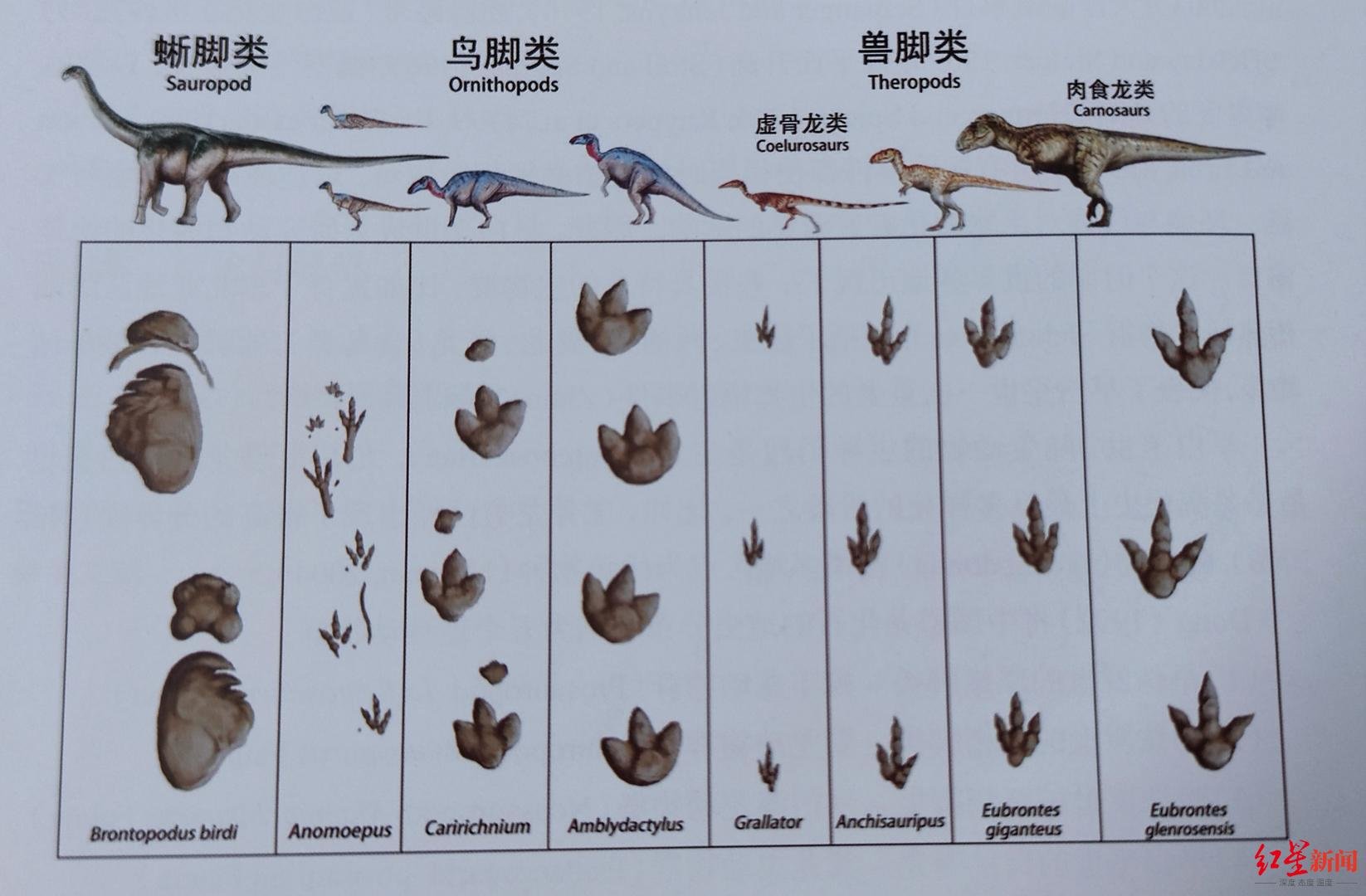 目前,四川盆地这四类恐龙足迹基本的特点是:兽脚类以两足行走,后脚脚趾细长,三个脚趾着地,它们的足迹一般是三趾型的,脚趾印窄长,尖锐的脚爪通常留下很深很清晰的爪痕,当然也有两个脚趾着地的驰龙类,它们的足迹是二趾型;蜥脚类以四足行走,脚板宽大,而且前脚脚趾着地,后脚脚趾和脚掌都着地,它们的足迹一般前脚印相对比较小,呈肾形或半圆形,而后脚印宽大,呈圆形或扇形,爪痕不明显;鸟脚类多以两足行走,也是三个脚趾着地,但它们的足迹短宽、趾印粗短,整体呈圆形,爪痕不尖锐;覆盾甲龙类以四足行走,四个或五个脚趾着地,它们的足迹多为四趾型或五趾型,整体呈扇形,趾印短,爪痕钝。