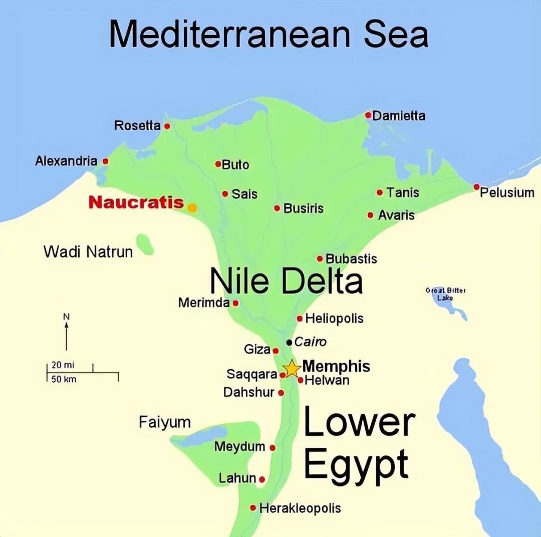 所以希腊人在尼罗河三角洲建立了一个造船厂和贸易据点、雇佣兵据点:诺克拉提斯,这个名字的字面意思就是“海上力量”,指的是海军军营,这里的希腊人为埃及法老提供雇佣军等服务。