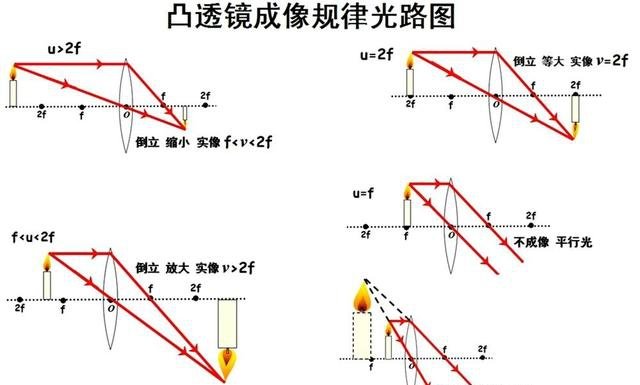 这一步尤为关键,因为无论是做实验还是看视频,都只是从现象上得到的结论,而不是从物理原理上得到的结论,所以,对于物体在两个特殊位置、三个区域中所成像的规律,必须得到理论上的支撑,也就是成像光路图!利用三条特殊光线中的两条光线,我们可以得到如下五个原理图。从而得到成像情况,以及物距和像距规律。