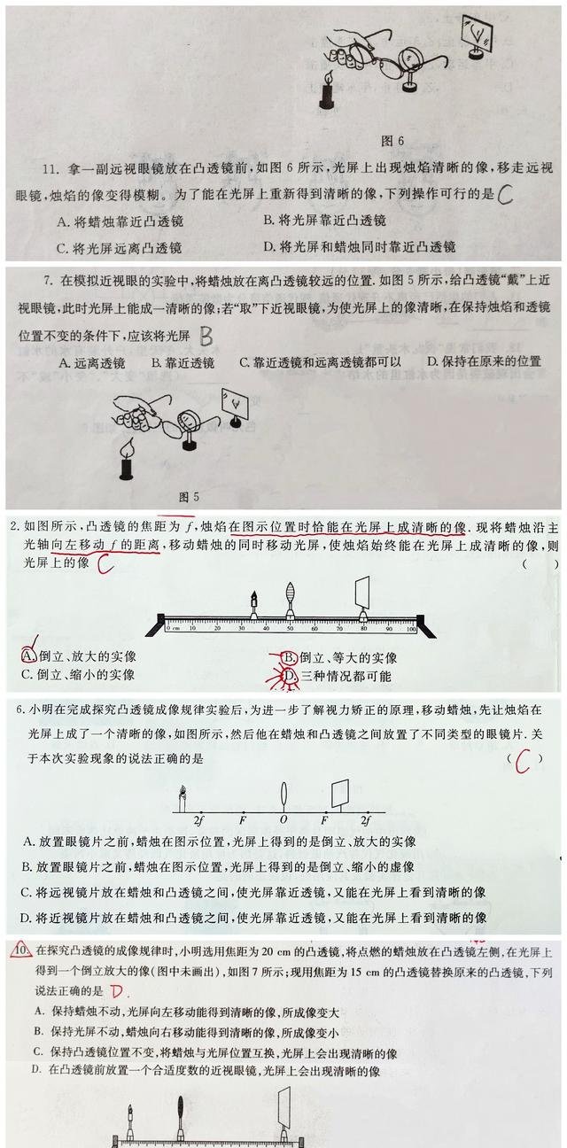 通过以上三种方法,最终彻底掌握凸透镜成像规律后,就可以在习题中大显身手了,结合各种题型,灵活运用以上规律,类似下面的这种题就会在中考时成为送分题。
