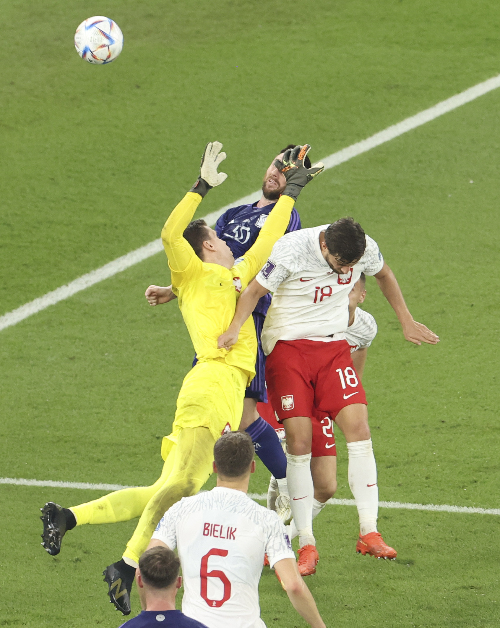11月30日,波兰队守门员什琴斯尼(上左)与阿根廷队球员梅西(上中)争抢高球时犯规,被主裁判判罚点球。新华社记者 韩岩 摄