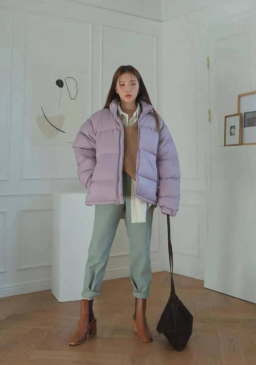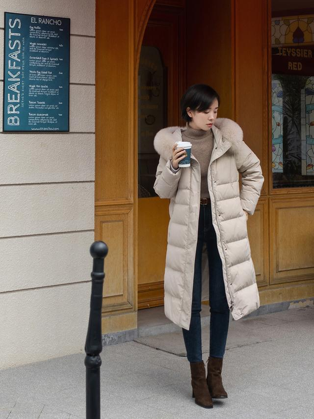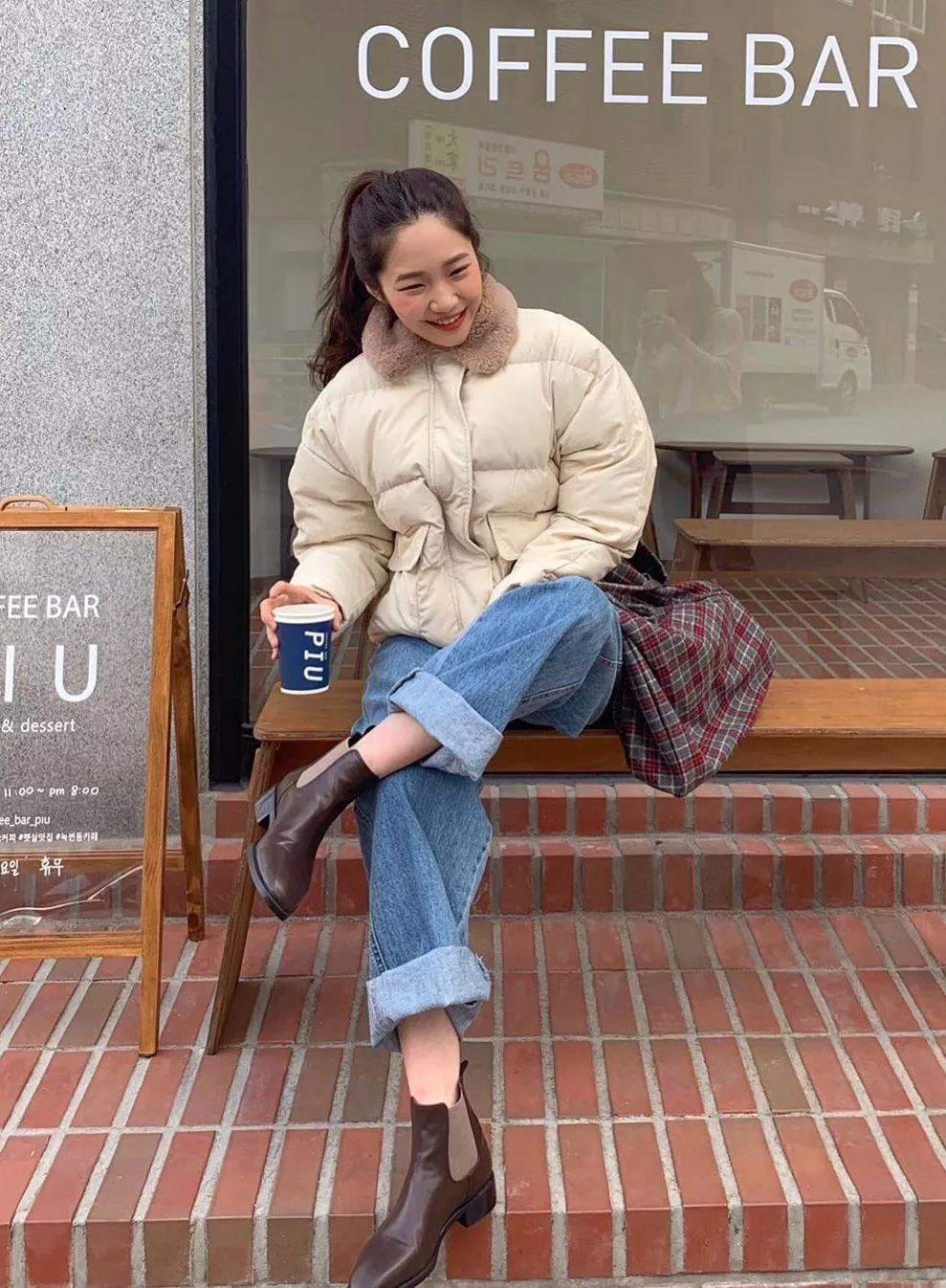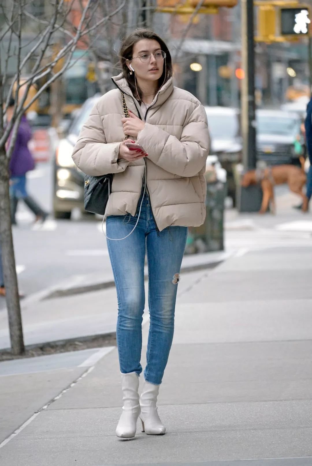 紧身的牛仔裤搭配宽松的羽绒服+短靴,这样上松下紧的组合,也可以起到显瘦显高的效果。