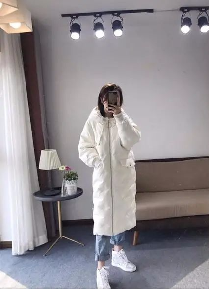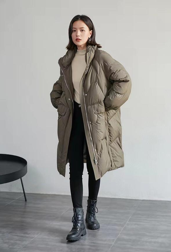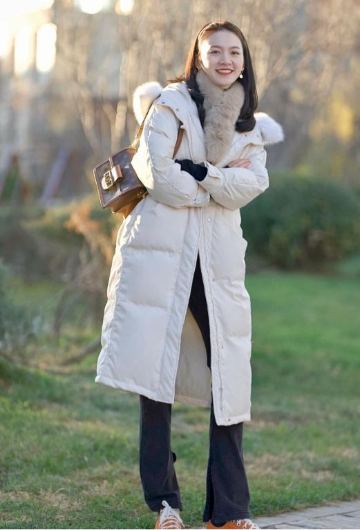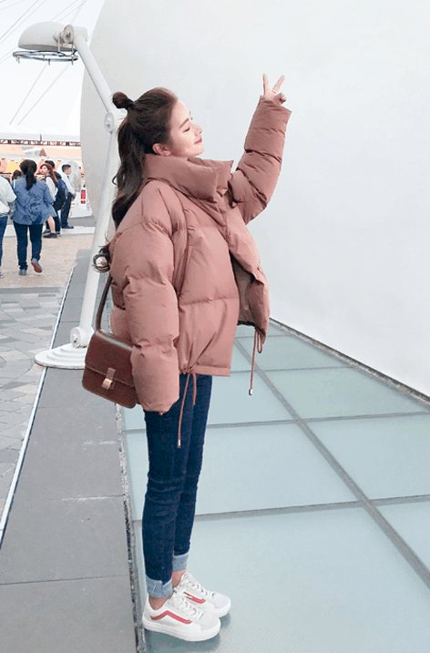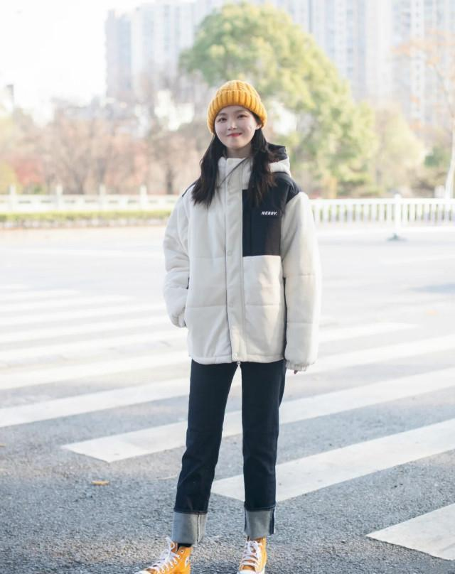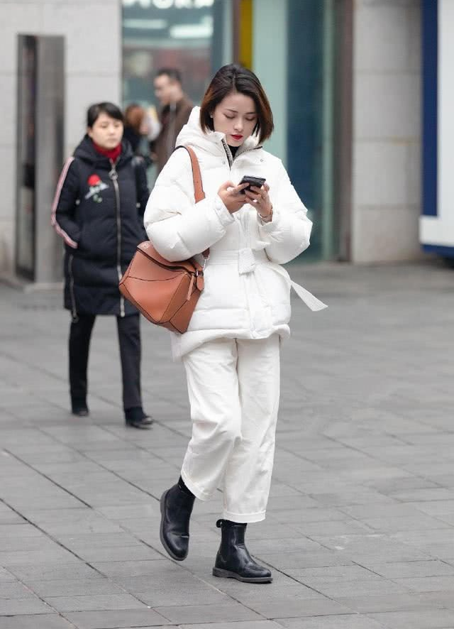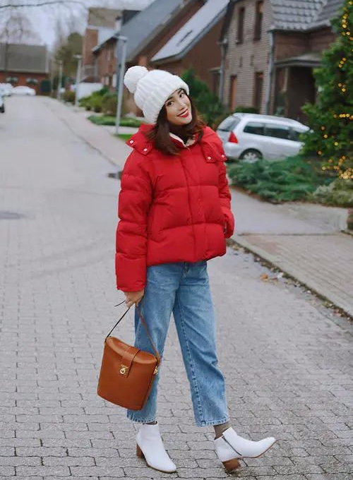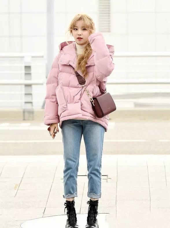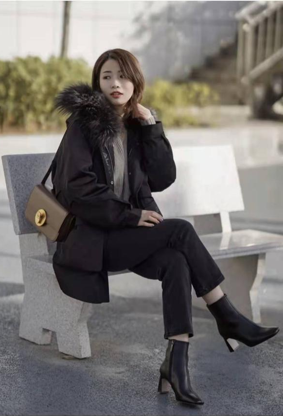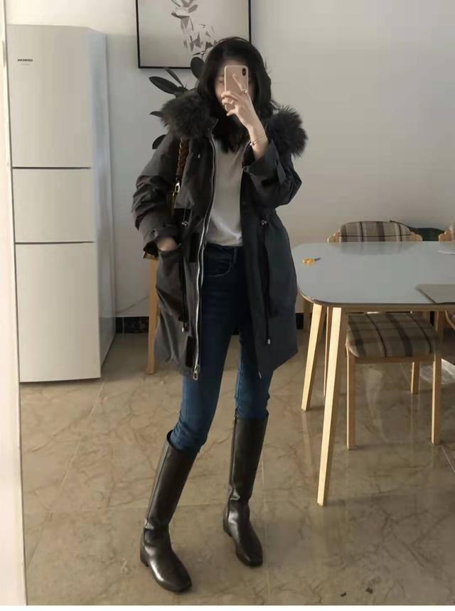 紧身的牛仔裤搭配宽松的羽绒服+短靴,这样上松下紧的组合,也可以起到显瘦显高的效果。