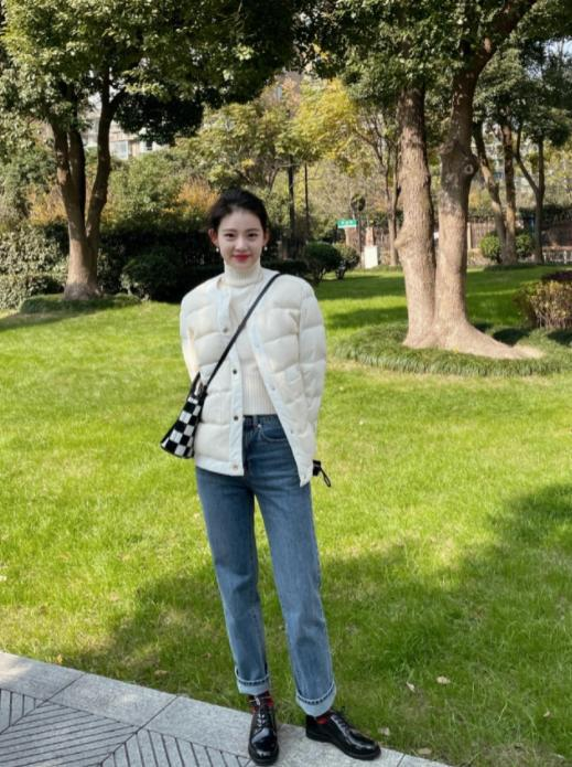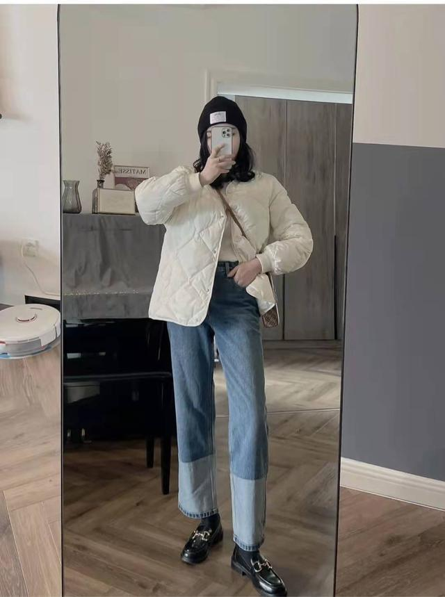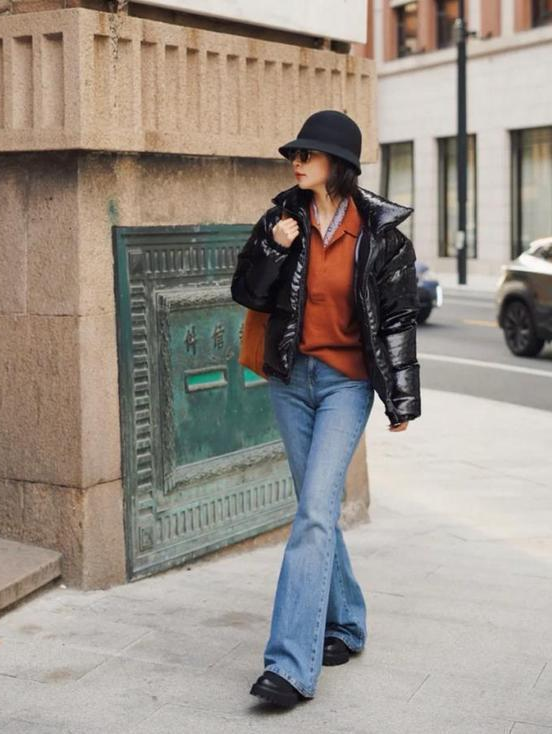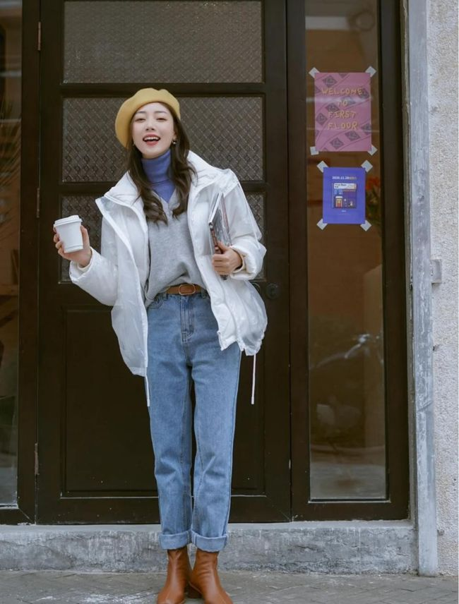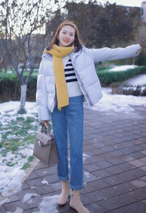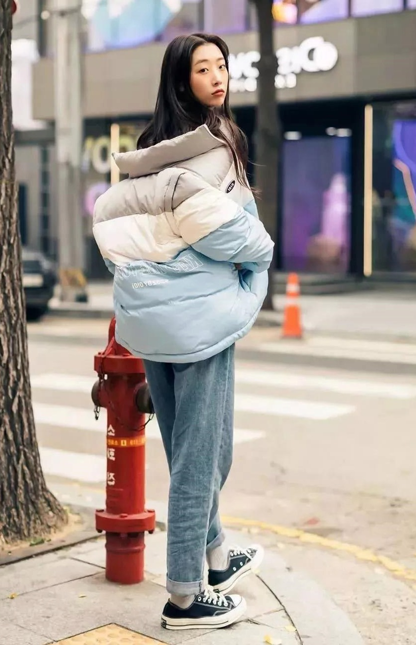 蓝色直筒牛仔裤配一件羽绒服,让原本萧瑟的冬天仿佛裹了几分春意,整体氛围都明朗了几分。