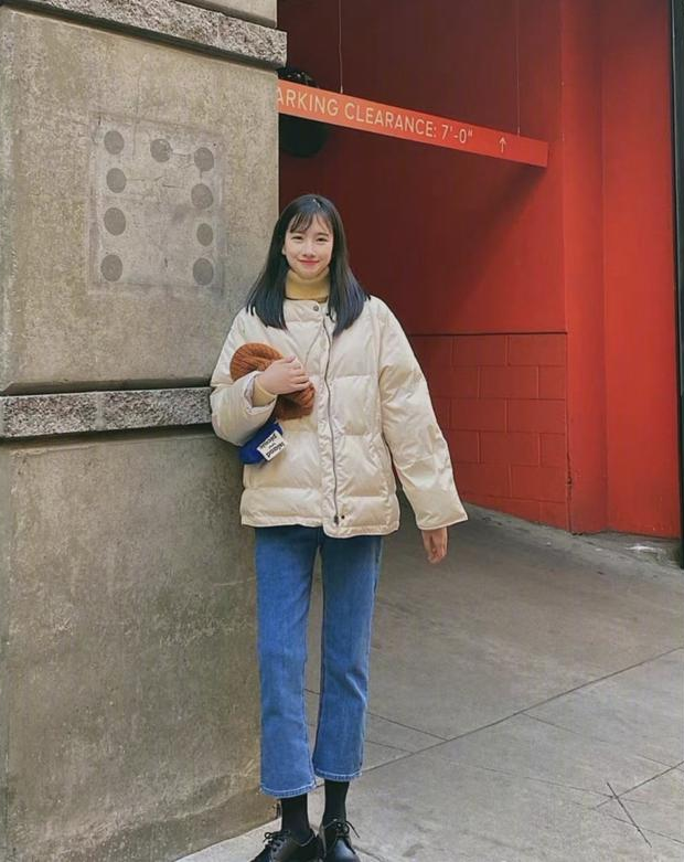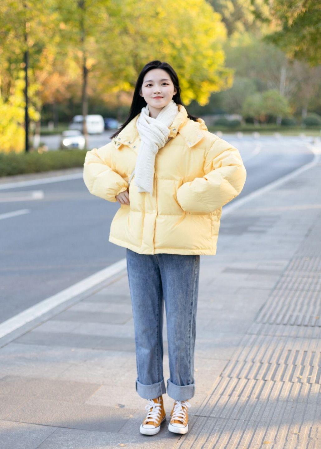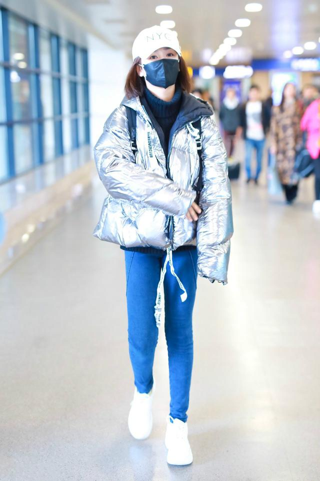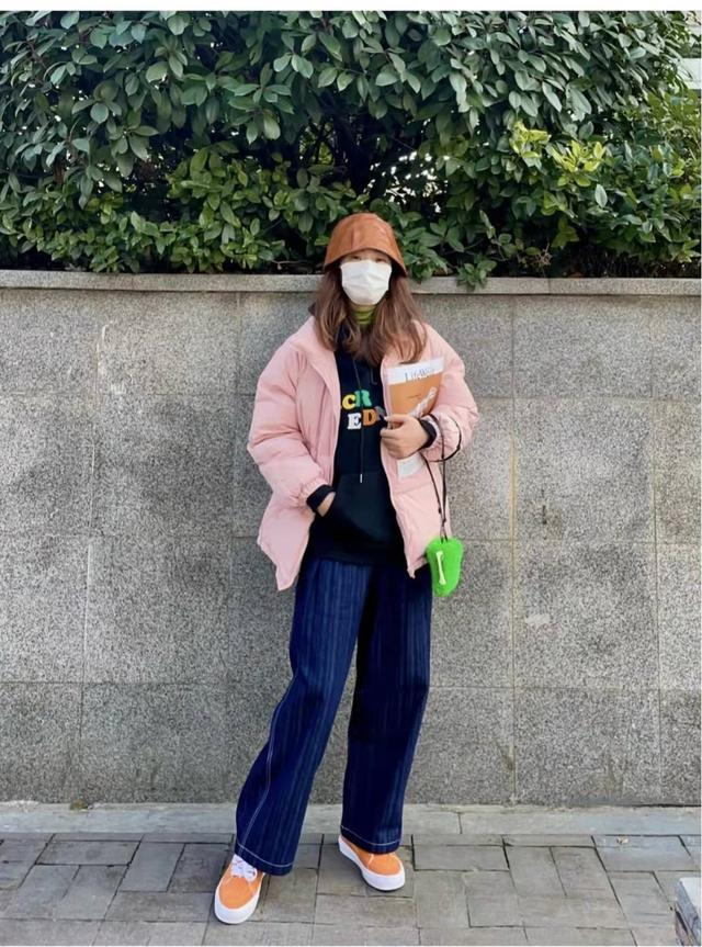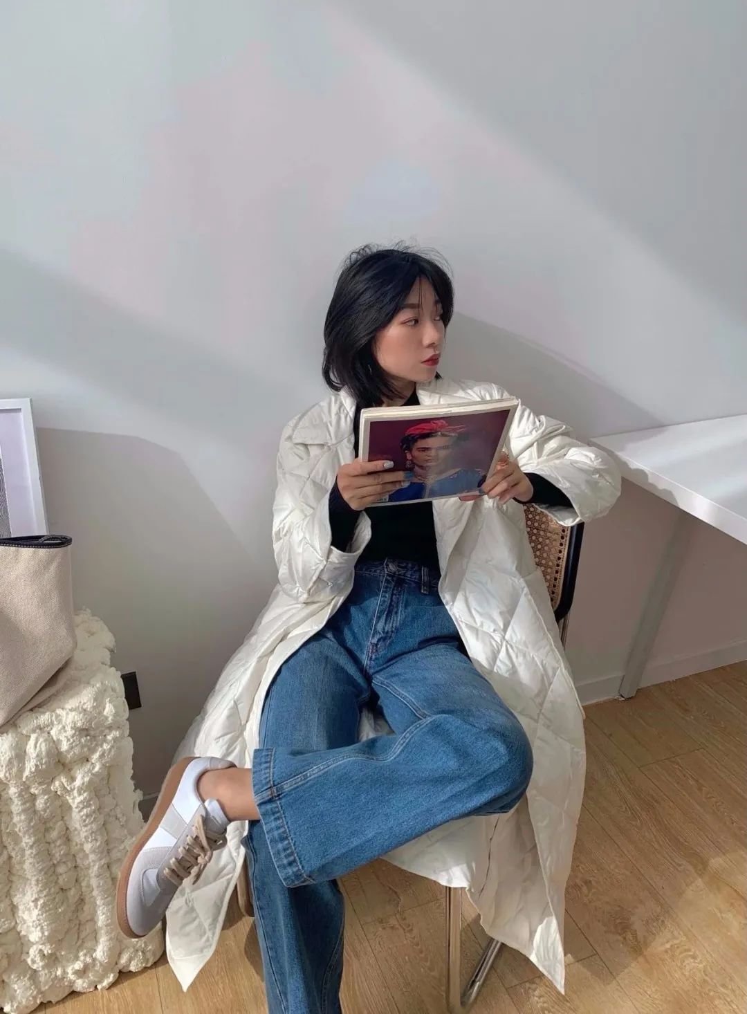蓝色直筒牛仔裤配一件羽绒服,让原本萧瑟的冬天仿佛裹了几分春意,整体氛围都明朗了几分。