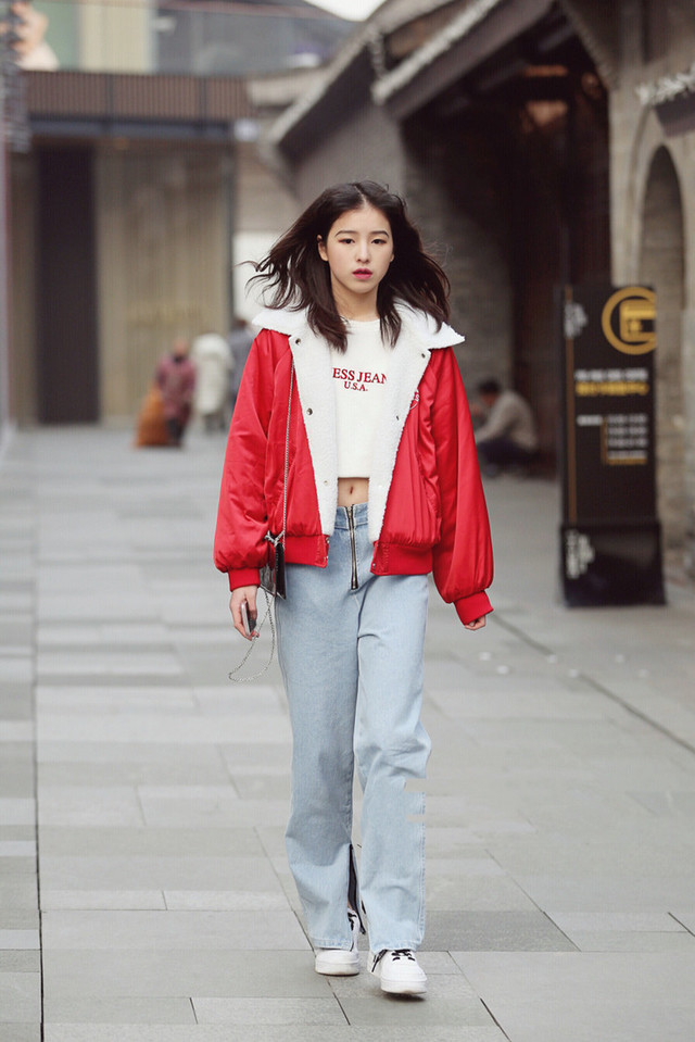 有时还可以将牛仔裤的裤腿挽起来一圈,从细节上丰富层次。
