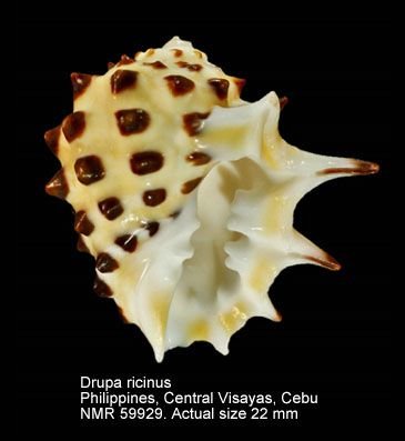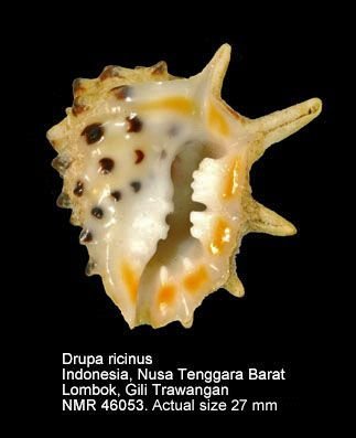 黄斑核果螺,拉丁文学名Drupa ricinus (Linnaeus, 1758) ,其外唇缘具光亮的杏黄色斑块和长棘,是该种的显著特征,较为容易辨认。