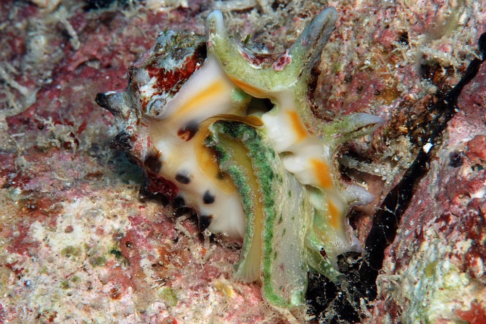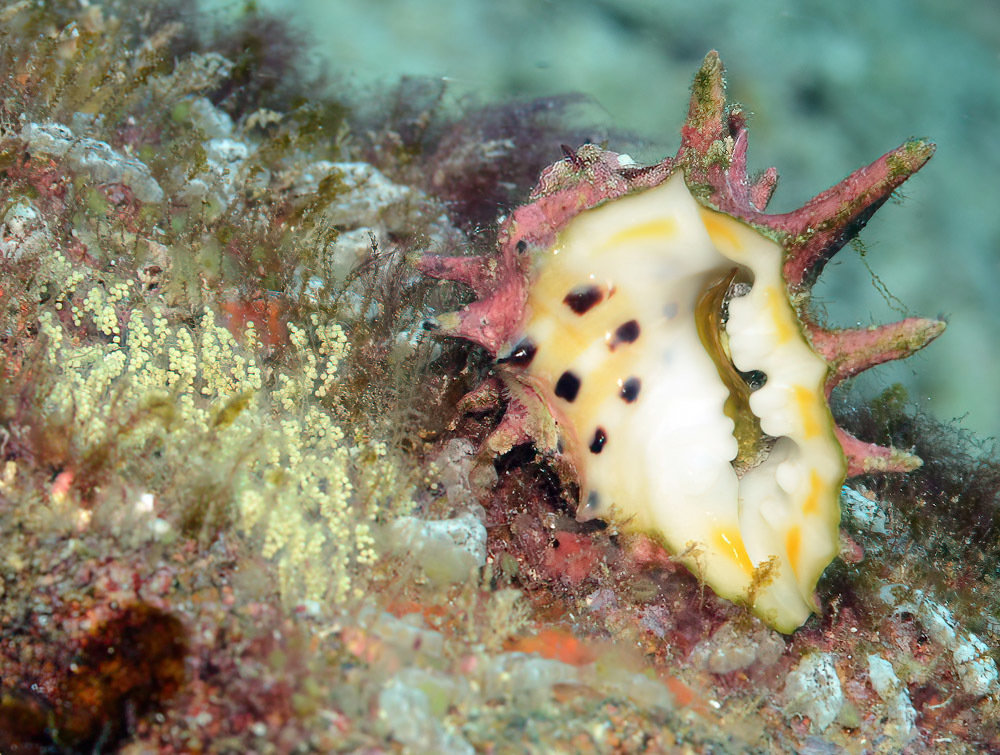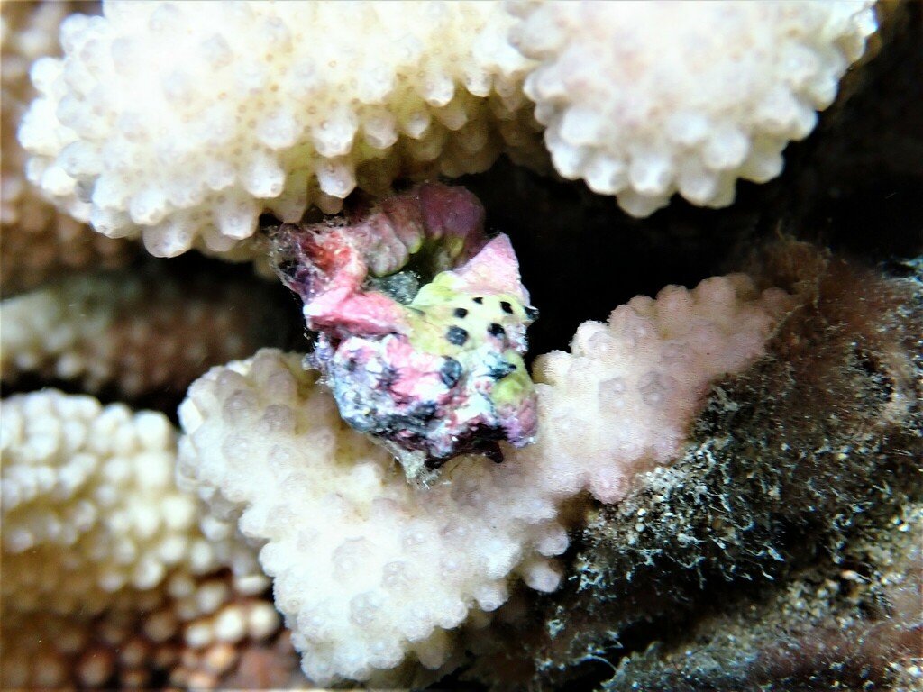 黄斑核果螺为暖海产,一般生活在潮间带岩礁或珊瑚间。