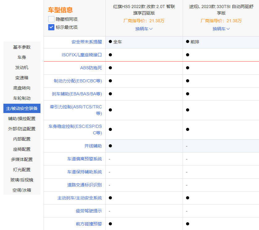 在配置表现上,我们选取了两车指导价同为21.38万的红旗HS5 2022款 改款 2.0T 智联旗享四驱版和途观L 2023款 330TSI 自动两驱舒享版进行对比,看看谁的配置更丰富。