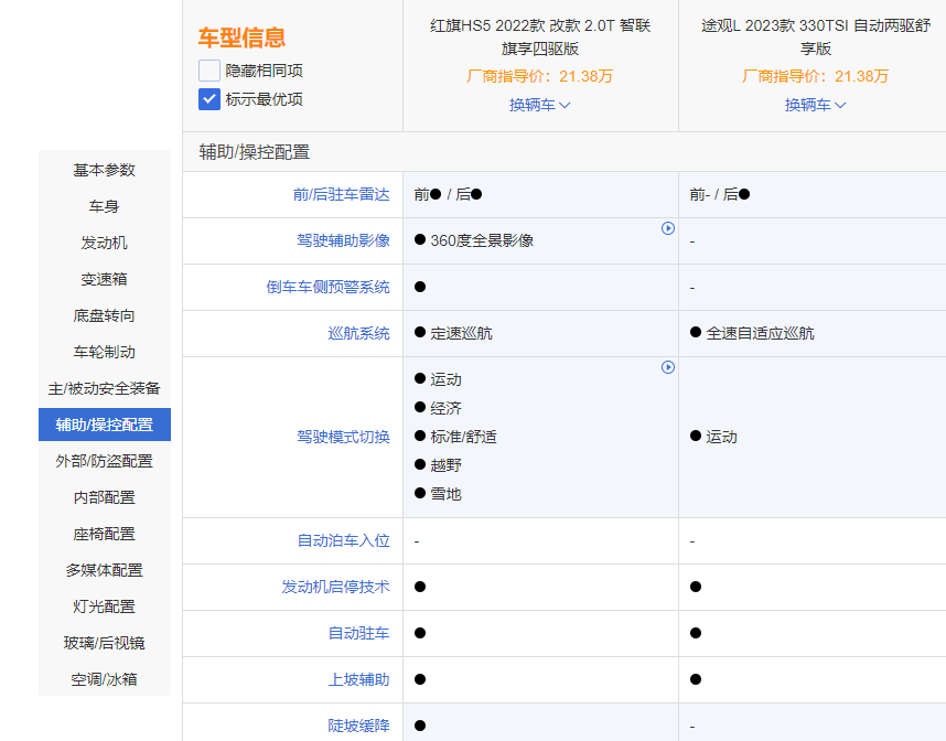 在辅助/操控配置方面,红旗HS5独有倒车车侧预警系统、更多驾驶模式切换等,途观L独有全速自适应巡航。