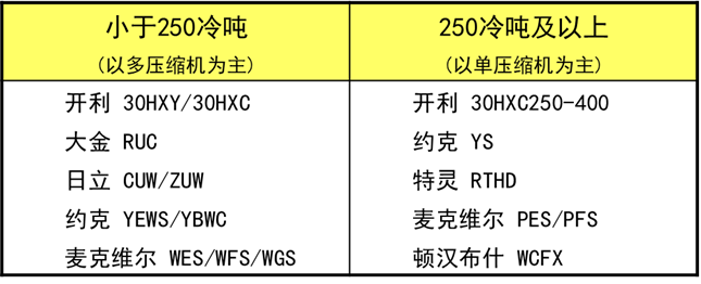 主要品牌有:开利,约克,特灵,麦克维尔,顿汉布什,大金,日立。