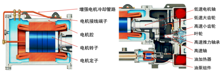 油泵、油过滤器和油冷却器构成一套润滑系统,位于压缩机-电机组件齿轮传动箱铸件一端。润滑油由油泵压进过滤器组件去除杂质,送至油冷却器,冷却到适当的温度,然后分两路:一部分油流到齿轮和高速轴承;余下的流到电机轴承。油进入齿轮箱下方的油箱完成润滑循环。