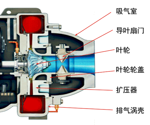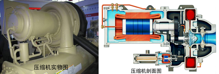 压缩机不断的从蒸发器中抽出制冷剂气体,气流量由导叶的开启度而定。由于压缩机抽取制冷剂减低了蒸发器的压力,使蒸发器里剩余的制冷剂在相对低的温度(一般为3到6℃)沸腾蒸发。制冷剂气化吸取传热管内循环水的热量使之降温,得到空调或工业处理所需的冷水。