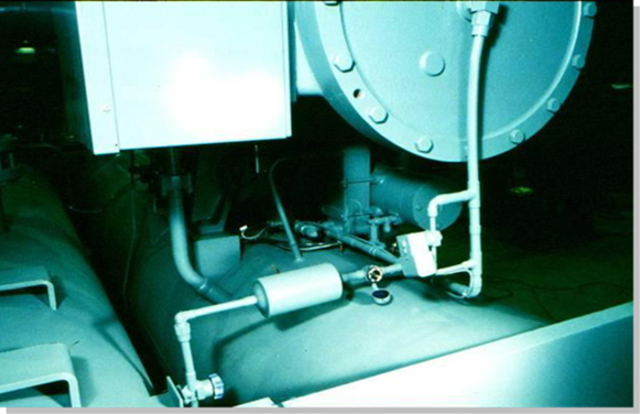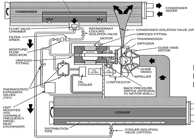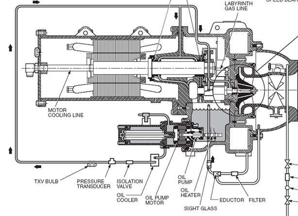 电机和润滑油由来自冷凝器筒身底部的过冷液态制冷剂冷却。由于压缩机运行保持的压力差,使制冷剂不断流动。制冷剂流过一只隔离阀,一只过滤器,一只视镜/湿度指示器之后,分流至电机冷却和油冷却系统。
