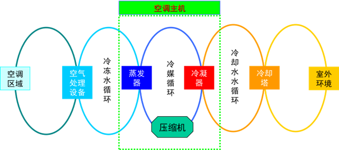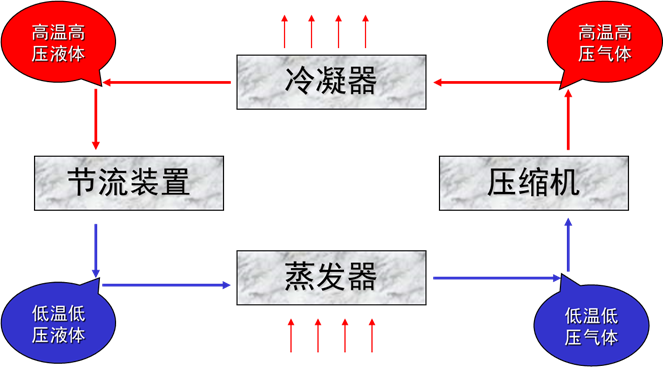 以制冷为例,压缩机将来自蒸发器的低温低压的制冷剂气体压缩成高温高压的制冷剂气体后,经冷凝器将制冷剂冷凝成高温高压液体,然后流经节流装置节流成低温低压的制冷剂气液两相物体,然后在蒸发器中吸收外界介质的热量,蒸发为低温低压的制冷剂气体,低温低压的制冷剂气体又被压缩机吸人。如此压缩--冷凝--节流--蒸发反复循环,制冷剂在蒸发器侧不断带走外界介质的热量,从而起到制冷的效果。