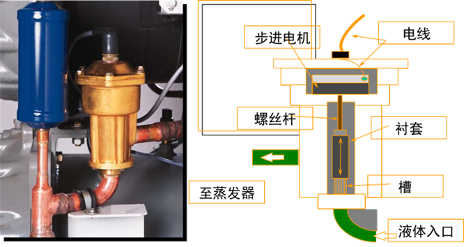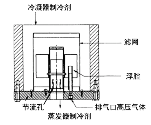 液体制冷剂流过此浮阀时节流,制冷剂回到低温低压状态进行蒸发,又开始制冷循环。