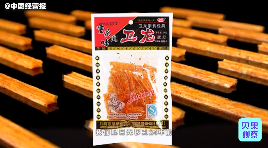 我们把目光移到24年前,一场特大洪水席卷平江,制作特产酱干的大豆价格疯涨产生危机,为了降低成本,不少人开始用小麦粉代替原有材料,于是就出现了最初的辣条——麻辣面筋。