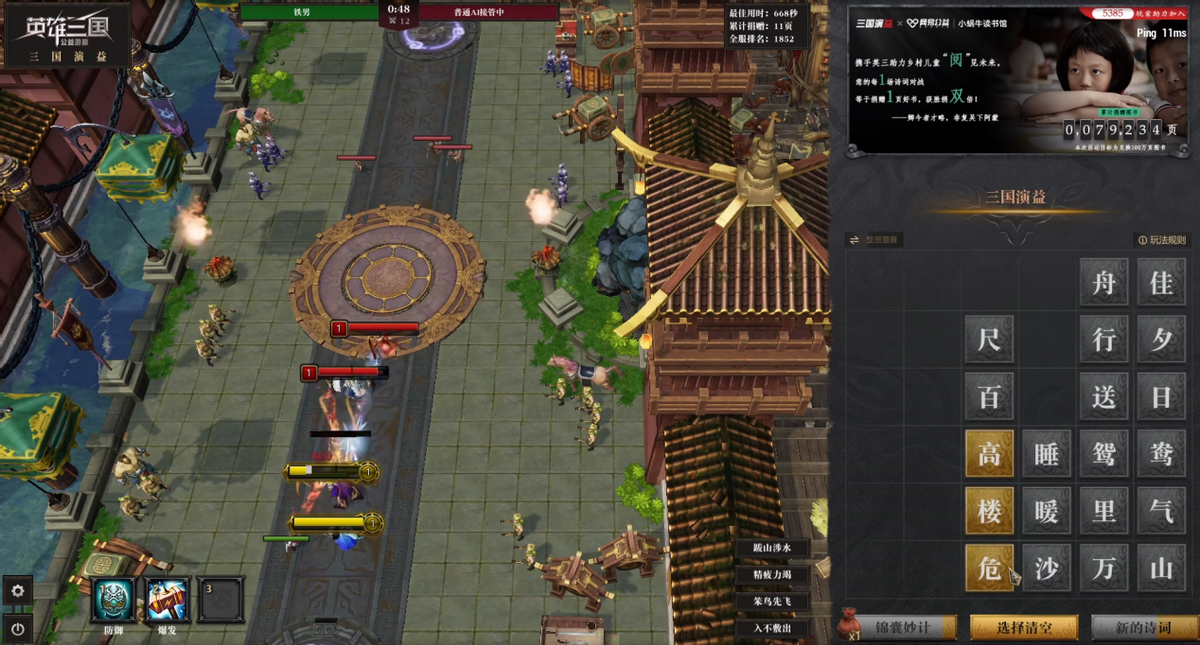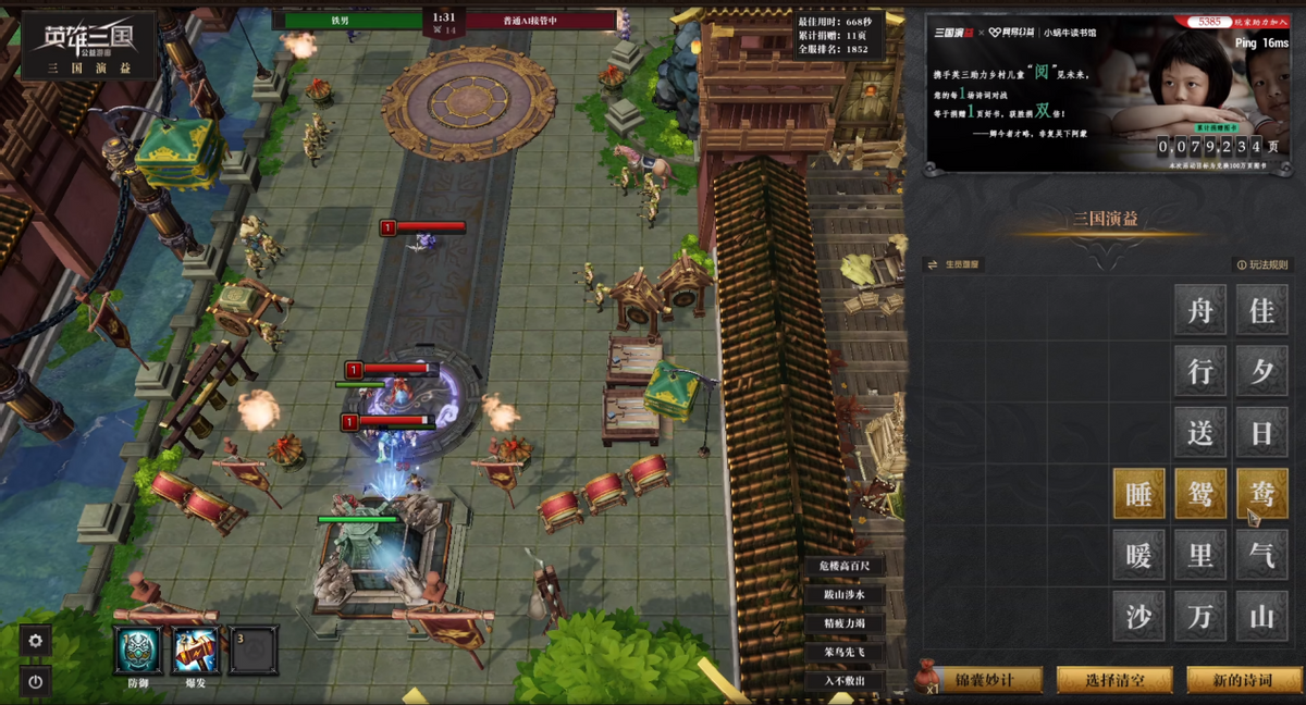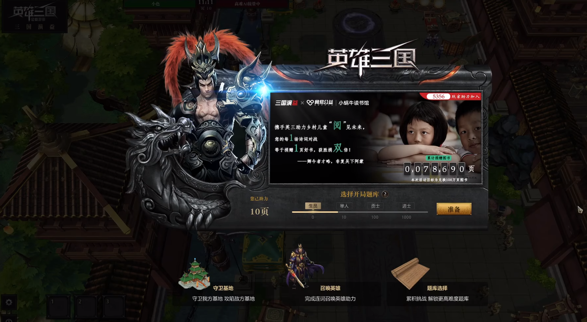 事情是这样的,近段时间网易游戏《英雄三国》开启了新游戏模式三国演“益”,玩家们利用题库里的字来组成词语召唤英雄,相互进行攻击。这项游戏模式还联合了“网易公益小蜗牛读书馆”,在快乐游戏的同时也为山区的儿童献上一份爱心,玩家每完成一局比赛就至少为山区儿童献上一页好书。