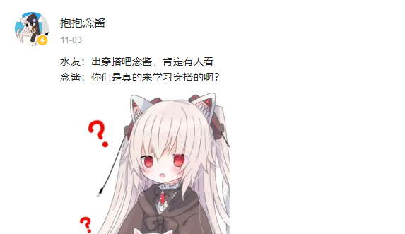 而今天晚上21点,抱抱念酱带着自己的穿搭和动感光波来到某牙二次元区,去“学习”的小伙伴做好笔记,我们一起学穿搭。