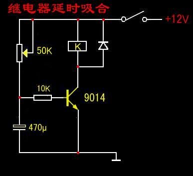 电路分析:当开关被按下的时候,12V的电压就会流经50K的电位器,电位器的一端,连接在10k电阻的位置,当有电压过来基极的时候,三极管被导通,三极管导通之后,集电极与发射极,形成了通路,继电器的线圈K通电,继电器吸合,常开触点,变成常闭触点。